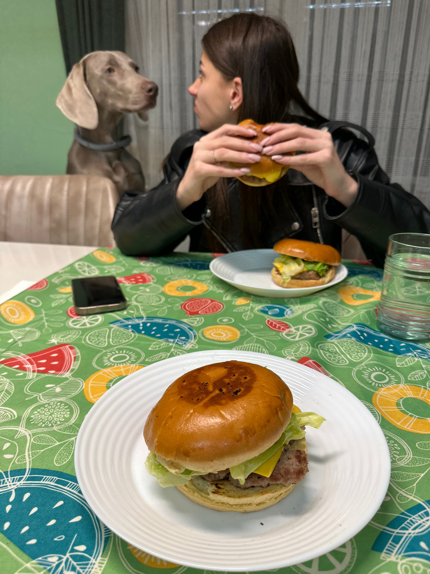 The image depicts a woman in a black leather jacket holding a hamburger with both hands, seemingly about to eat it. A Weimaraner dog is seated next to her, looking up towards the woman. On the table i…read more