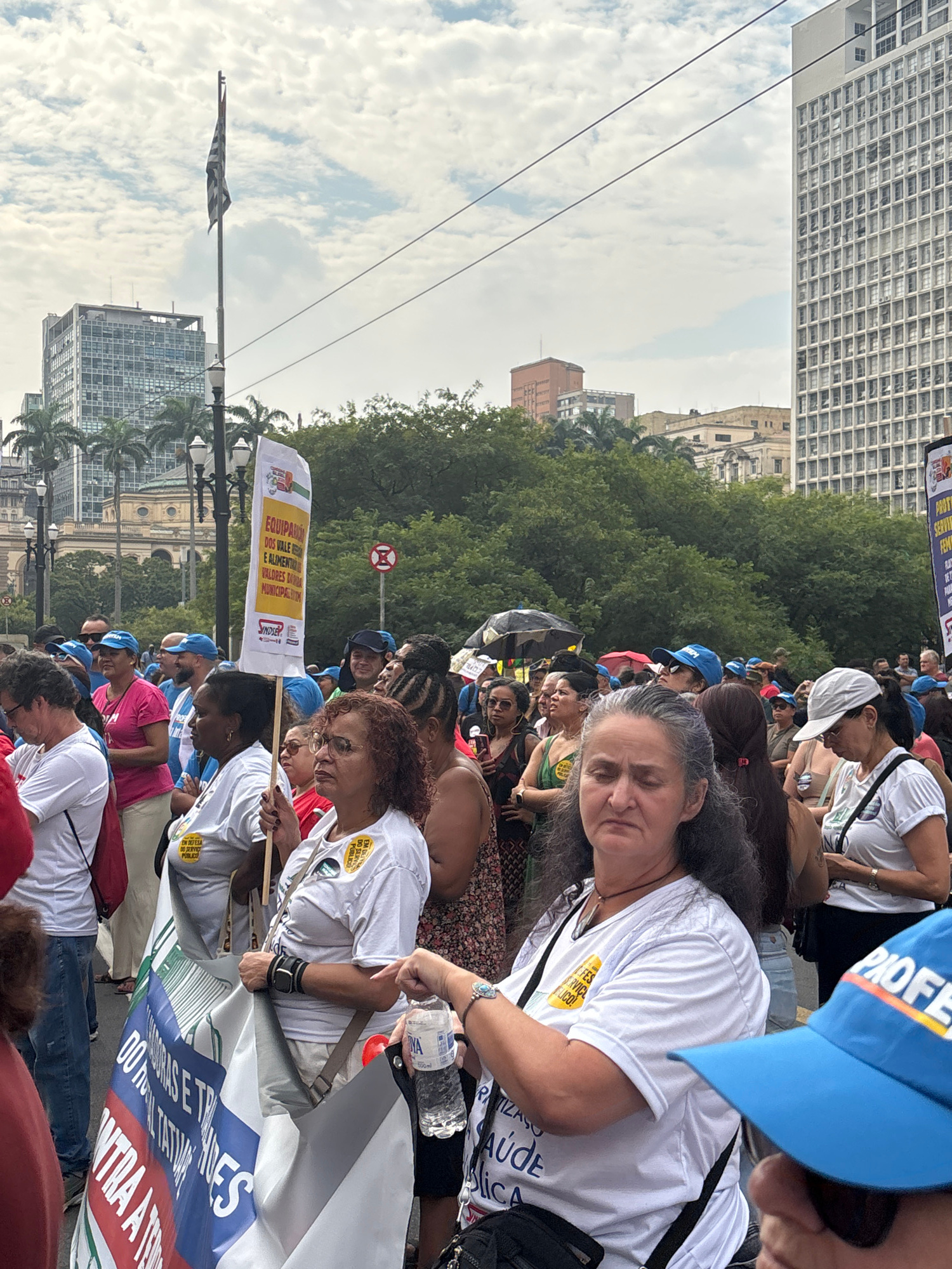 A street scene in São Paulo, Brazil, shows a dense crowd of people, many wearing white t-shirts and blue hats. They are holding signs and banners, some of which are identifiable with text like "EM DEF…read more