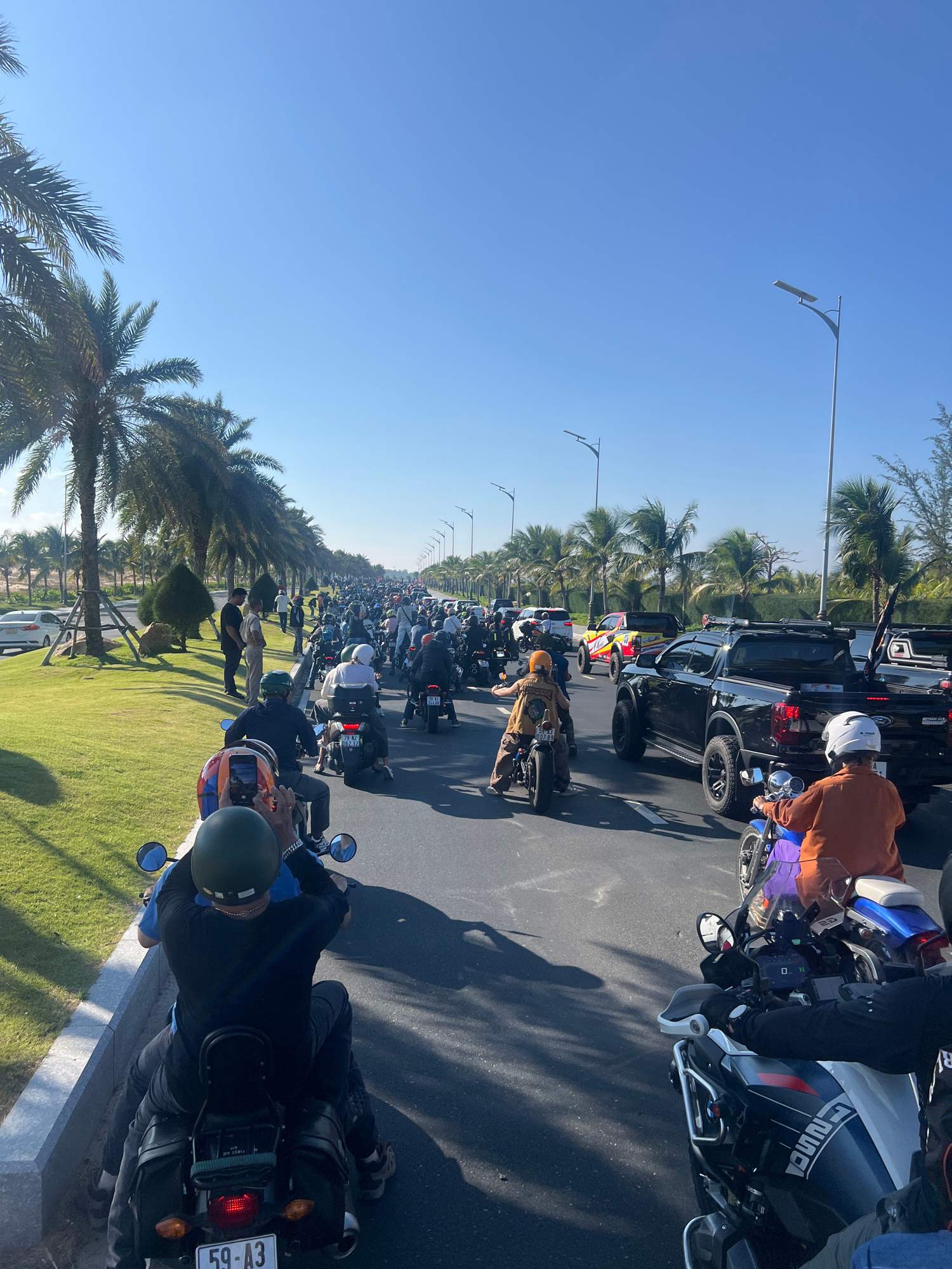 The image displays a wide-angle view of a multi-lane asphalt road in Cam Ranh, Vietnam, under a clear blue sky with strong daylight casting distinct shadows. A dense column of motorcycles, intersperse…read more