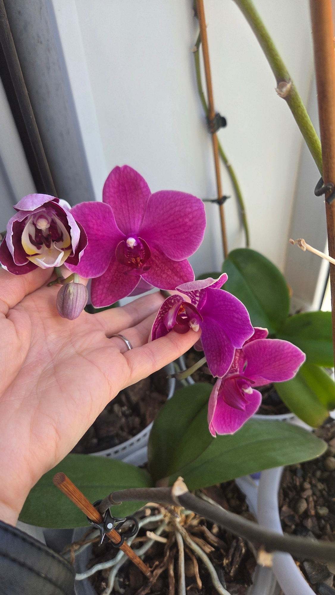 A medium, eye-level shot depicts a Phalaenopsis orchid plant with vibrant magenta flowers in bloom, held in a person's hand. The person's hand is light-skinned, with a ring visible on one finger. The…read more