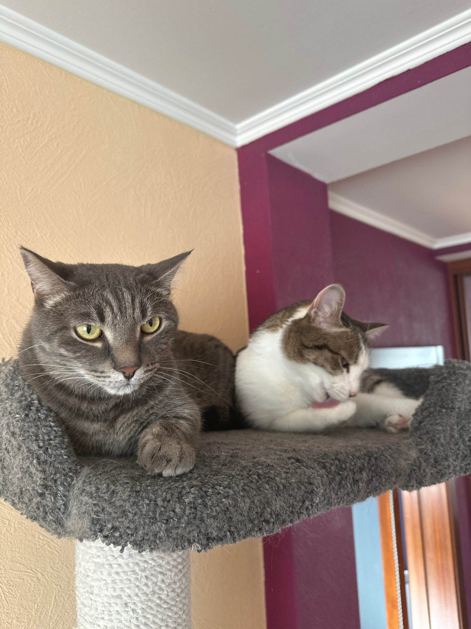 A low-angle, close-up shot shows two cats perched on a gray carpeted cat tree. In the foreground, a gray tabby cat with green eyes looks directly at the camera. Behind and above it, a white and brown…read more