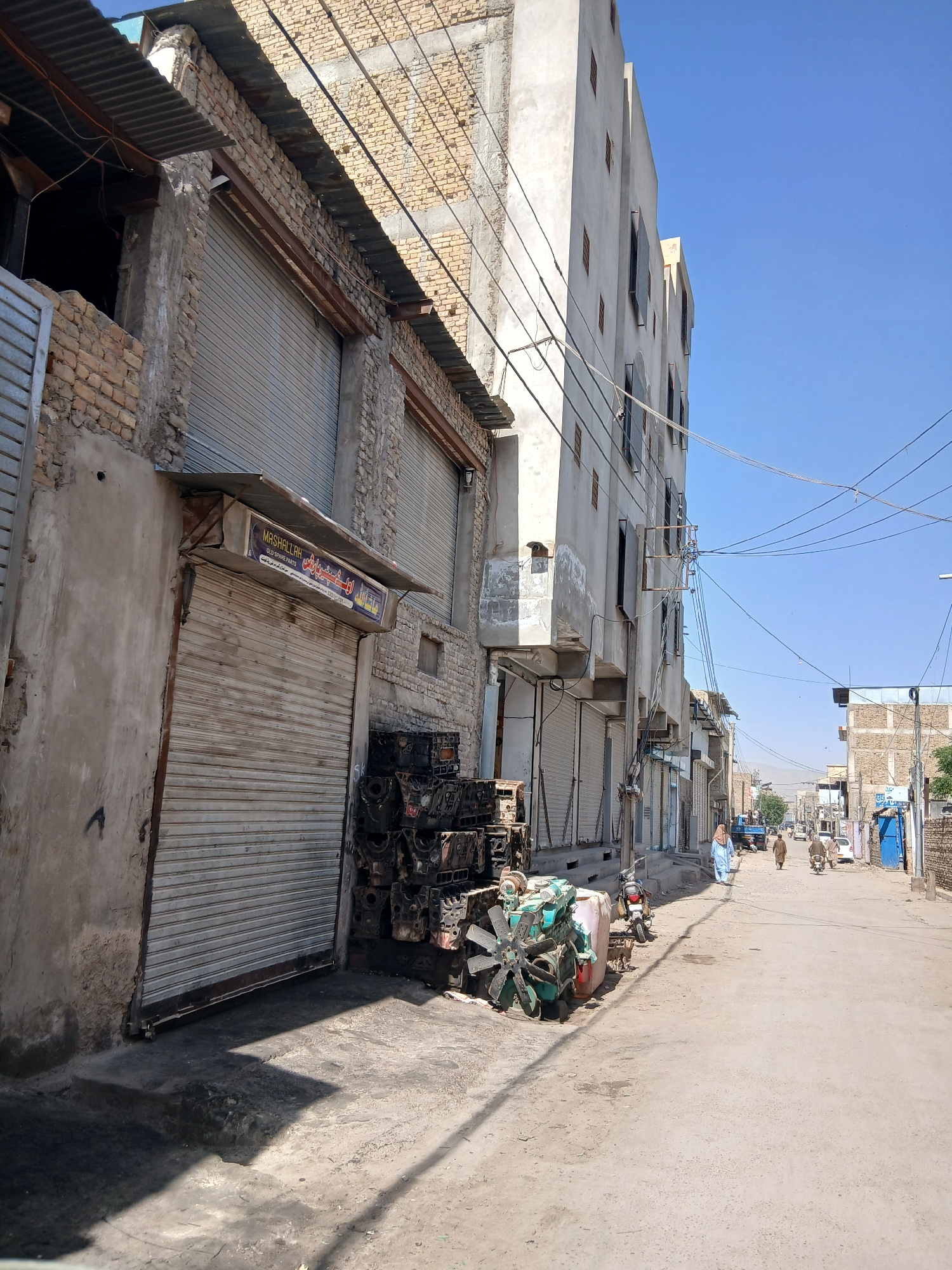 The image depicts a street scene in Quetta City Tehsil, Pakistan. The view is angled upwards, showing a row of aging buildings with closed metal shutters on the ground level storefronts. The buildings…read more