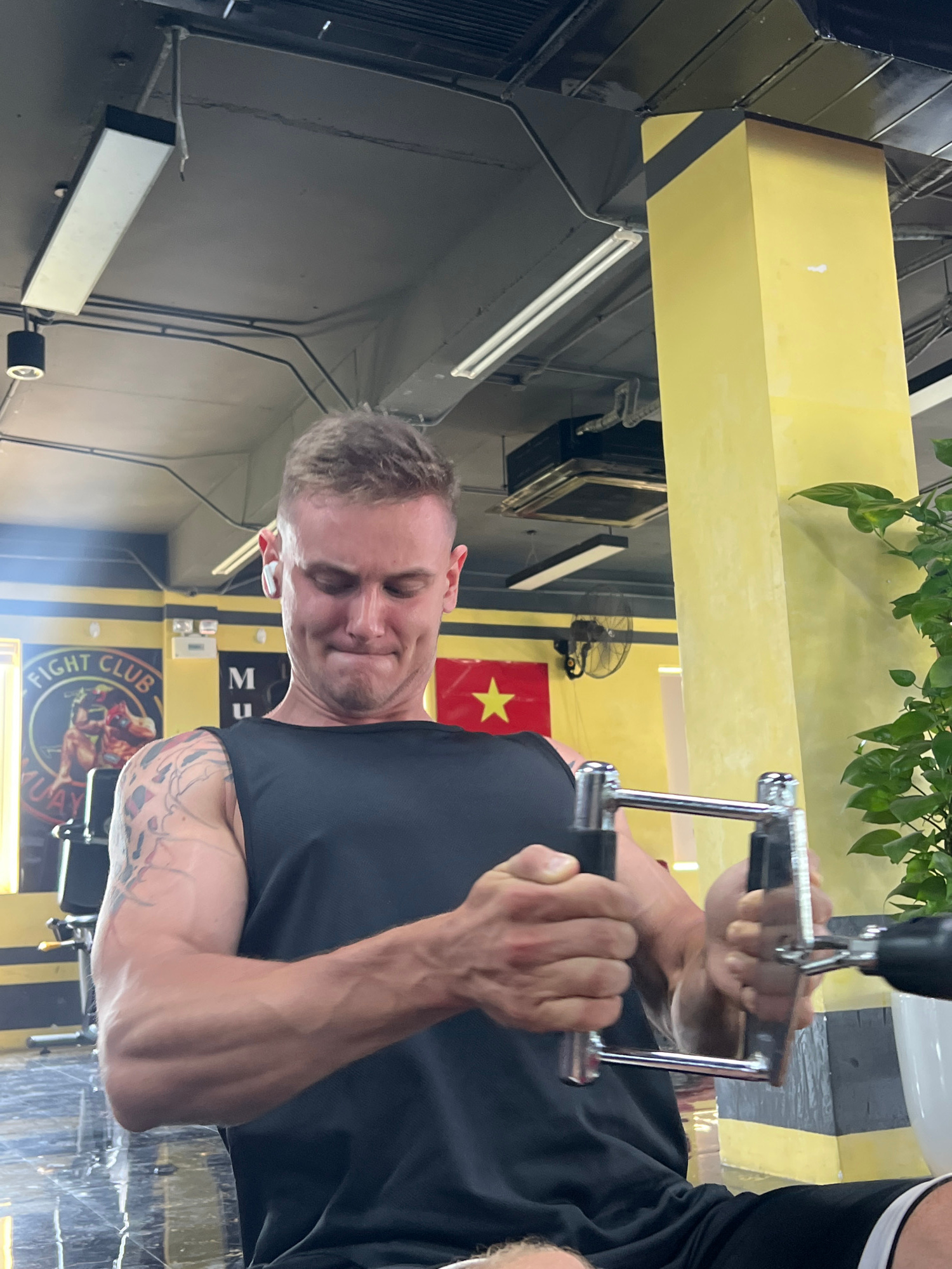 Inside a gym in Nam Nha Trang, Vietnam, a man with short blonde hair is lifting weights. He wears a black tank top and has tattoos on his right arm. A Vietnamese flag hangs in the background near a fa…read more