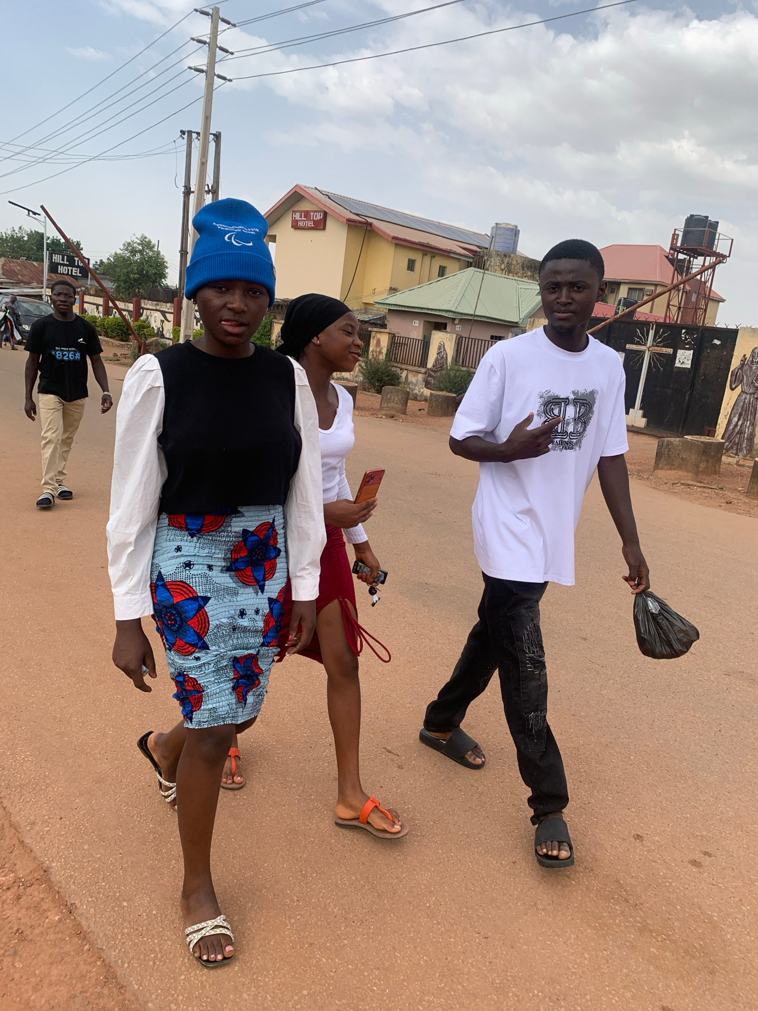Here is a detailed description of the image: **Scene:** The image shows three people standing on a street in a residential area. The street appears to be paved and is a reddish-brown color. Behind thβ¦read more