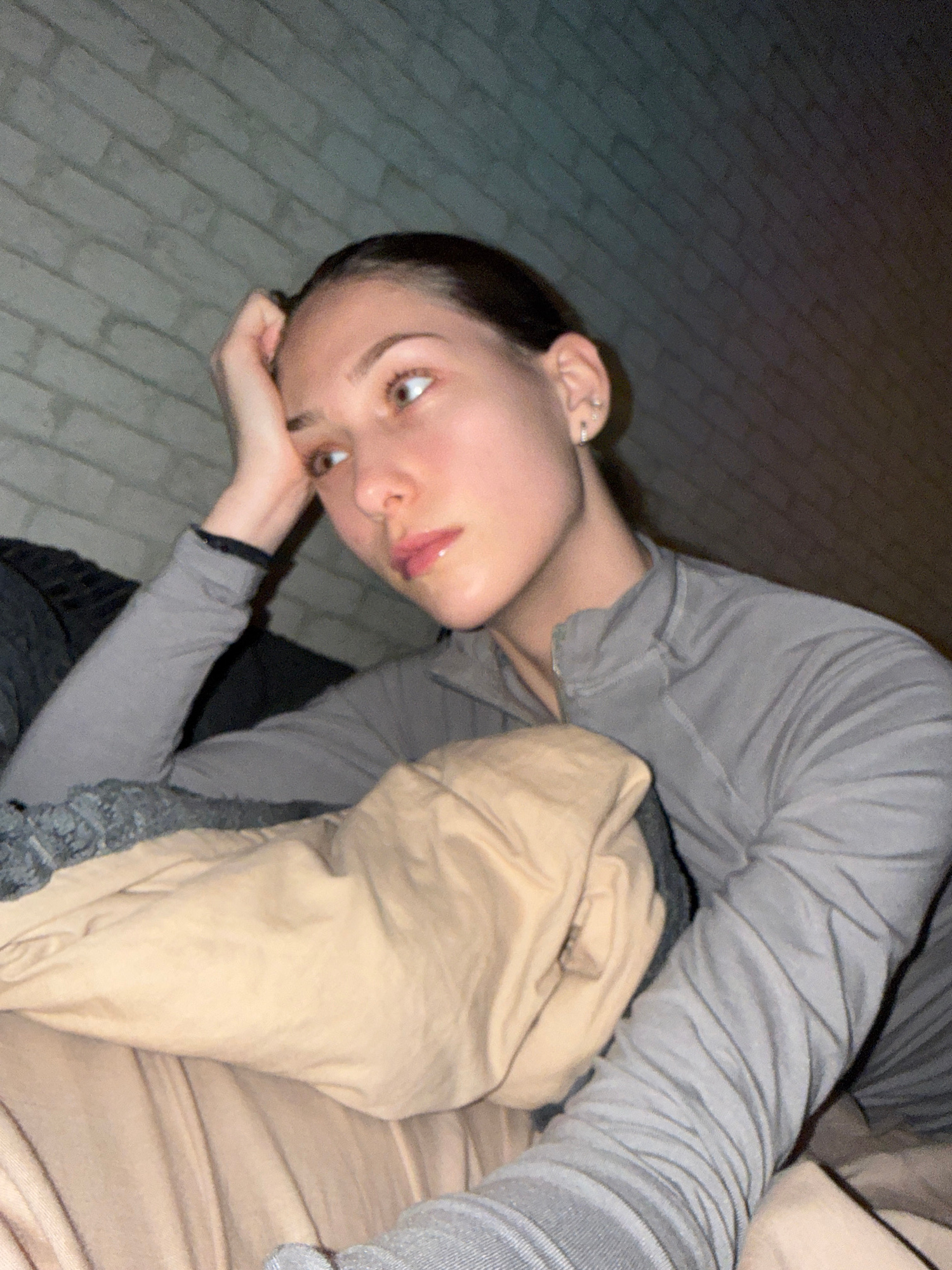 A young woman lies on a bed or sofa covered in beige and gray bedding. She wears a long-sleeved gray shirt or pajama top. Her head is tilted towards the left side of the frame, and her left hand rests…read more