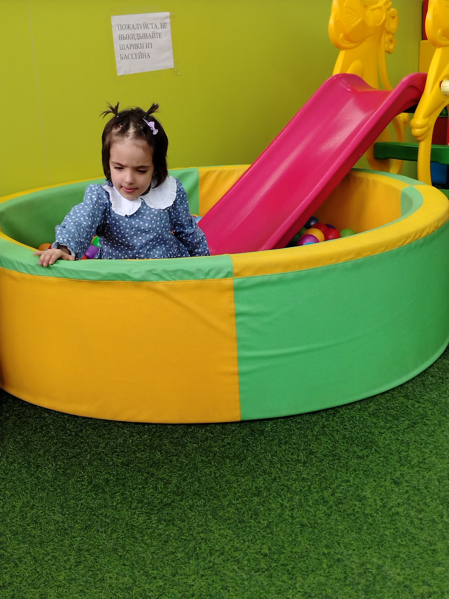 The image shows a young girl sitting in a ball pit with a slide. The ball pit has a green and yellow exterior and a pink slide. The girl is wearing a blue dress with a white collar. There is a sign on…read more