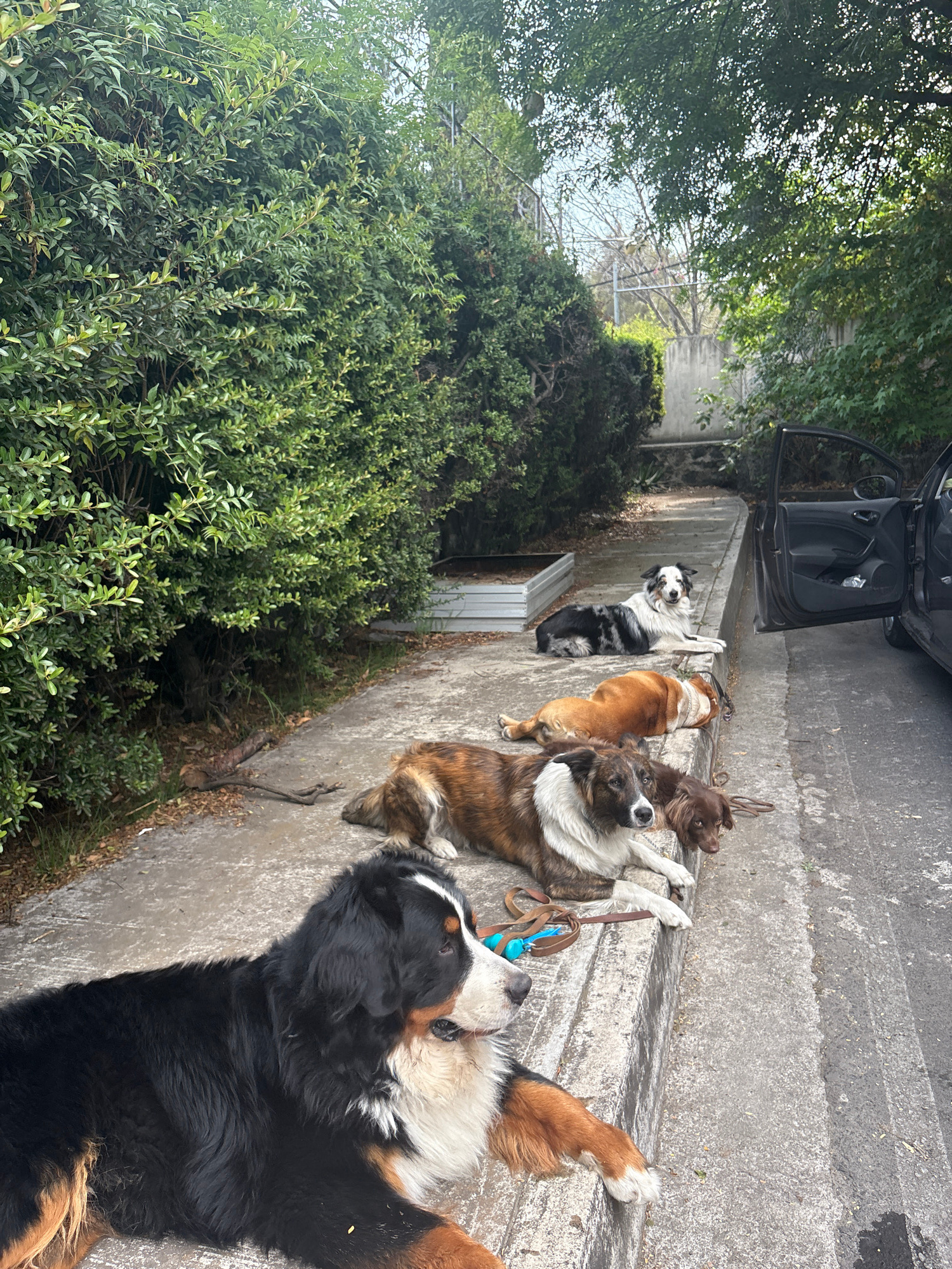 The image shows five dogs lying on a concrete path next to a black car with an open door. The dogs appear to be various breeds, including what appears to be a Bernese Mountain Dog in the foreground, a…read more