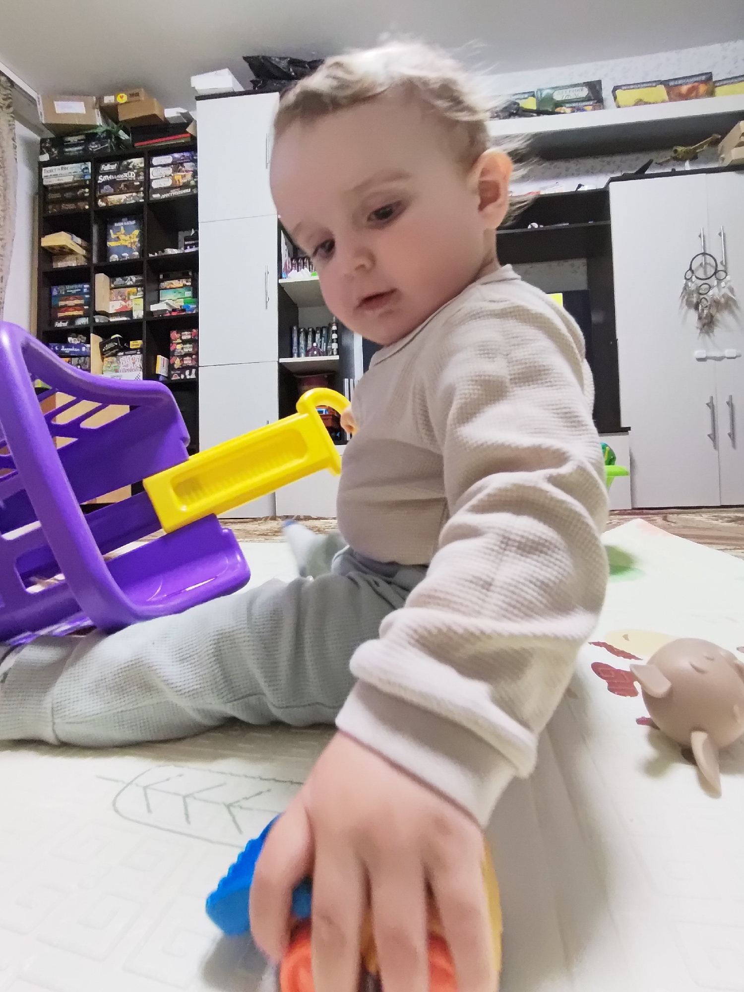 The sideways image captures a young child, likely a toddler, in an indoor setting in Markovskiy, Russia. The child, with light-colored hair, wears a light-colored, waffle-knit long-sleeved shirt and l…read more