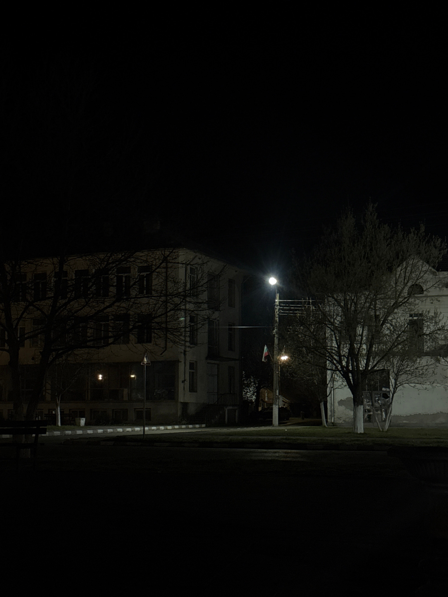 The image shows a night view in Lehchevo, Bulgaria. A multi-story building is partially illuminated by streetlights. Bare trees are visible in front of the building. To the right of the building, ther…read more