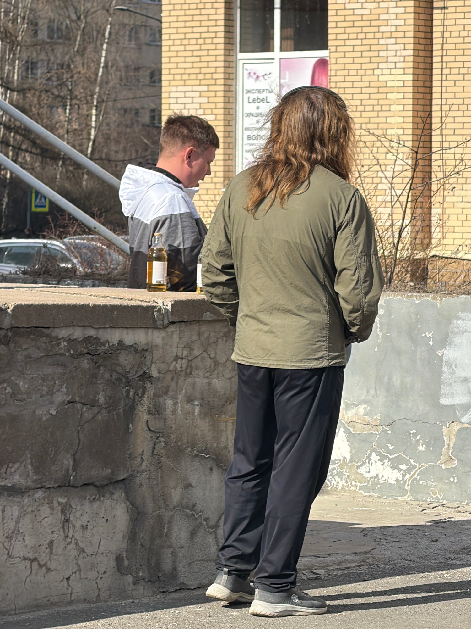 A daytime, medium-shot, ground-level outdoor image depicts two figures standing next to a concrete wall in what appears to be Saint Petersburg, Russia. The first figure, a man, is wearing a light-colo…read more