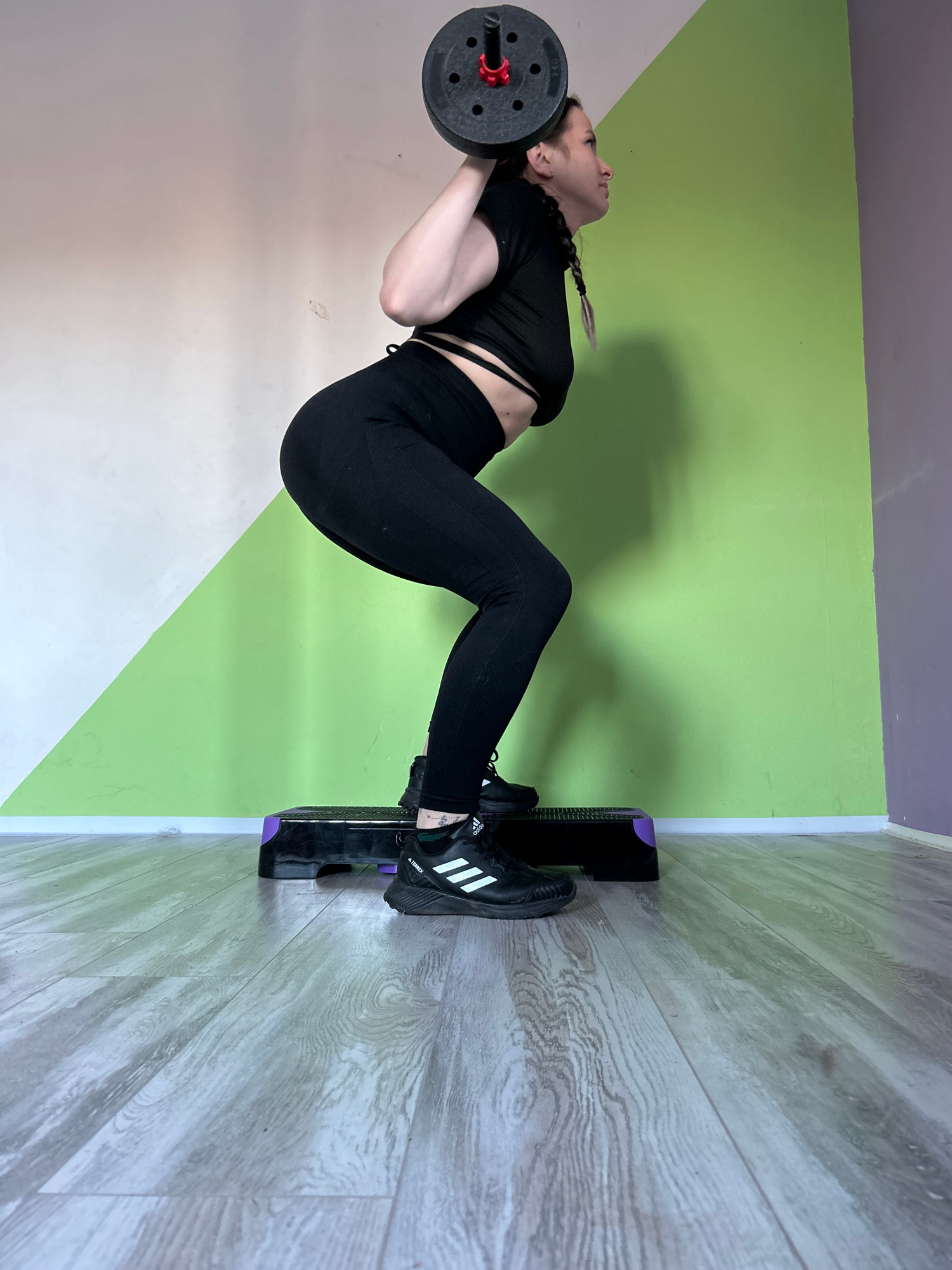 A woman is performing a glute bridge exercise with a barbell in an indoor setting. She is wearing black leggings, a black crop top, and black Adidas sneakers. Her feet are elevated on a step platform.…read more