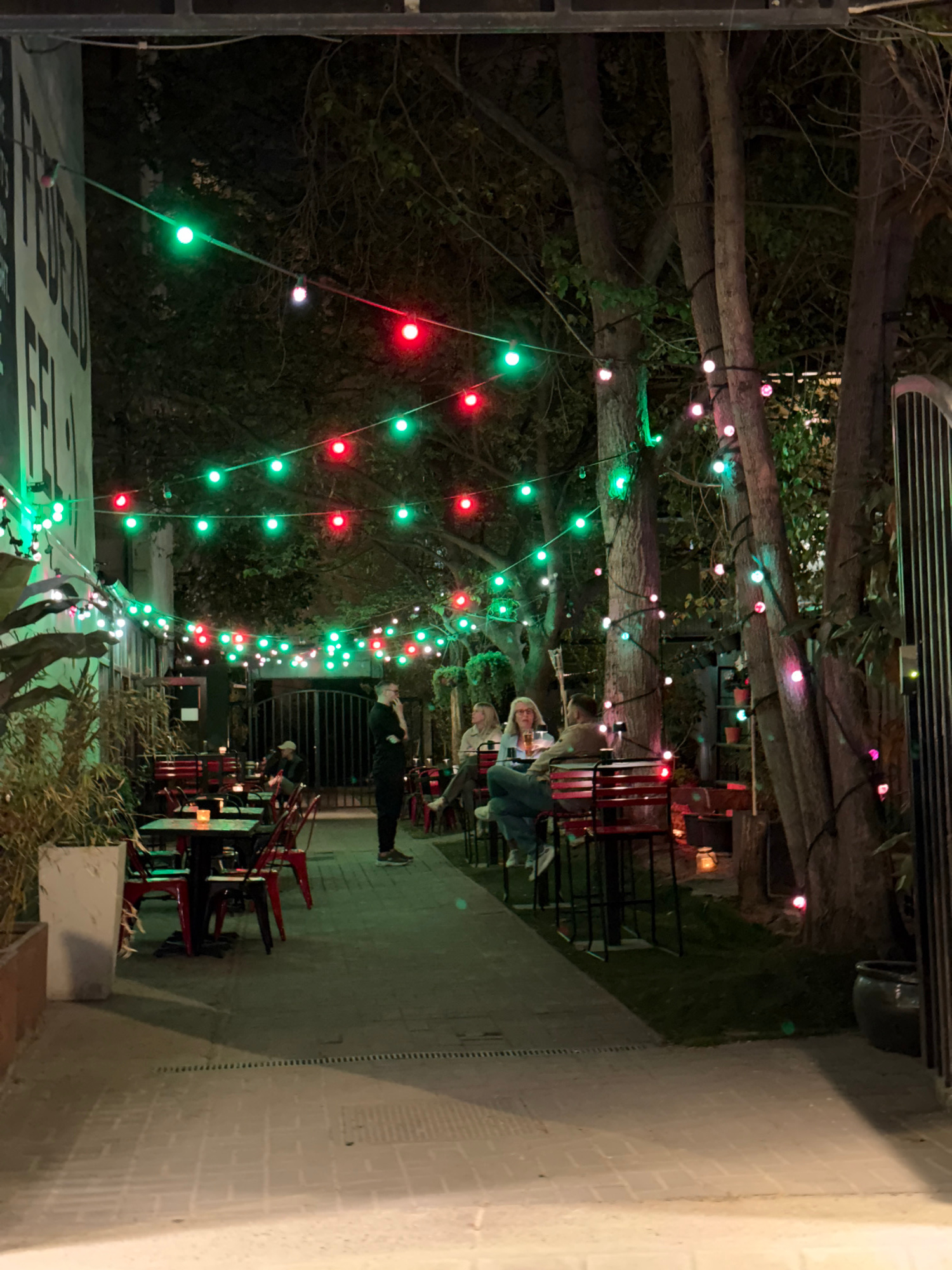 The image depicts an outdoor dining area at night, likely in a restaurant or bar setting. Red and green string lights are strung between trees, creating a festive atmosphere. Patrons are seated at tabβ¦read more