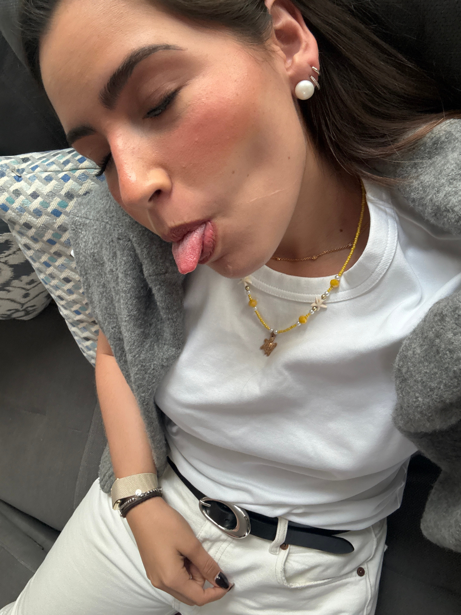 The image shows a person lying down. The person has brown hair and is wearing a white t-shirt, white pants, and a grey sweater. They are wearing a necklace with yellow and white beads, and a black bel…read more