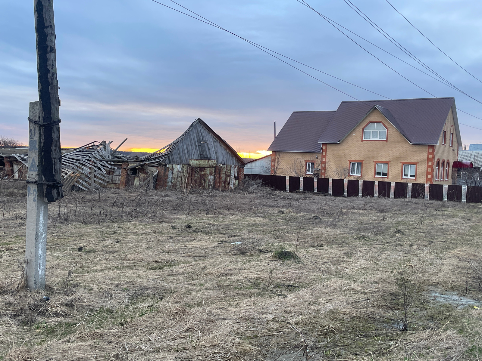 The image depicts a rural or semi-rural scene in Новая Шемурша, Russia. In the foreground, dry, brown grass covers the ground. A concrete utility pole stands on the left side of the frame. Behind it,…read more