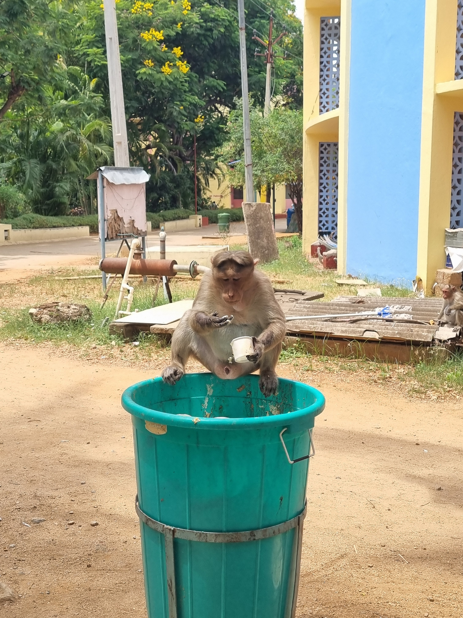 A medium shot reveals a monkey scavenging inside a turquoise plastic trash container, situated in Puttaparthi, India. The monkey is holding a white cylindrical object in its hands. The background incl…read more