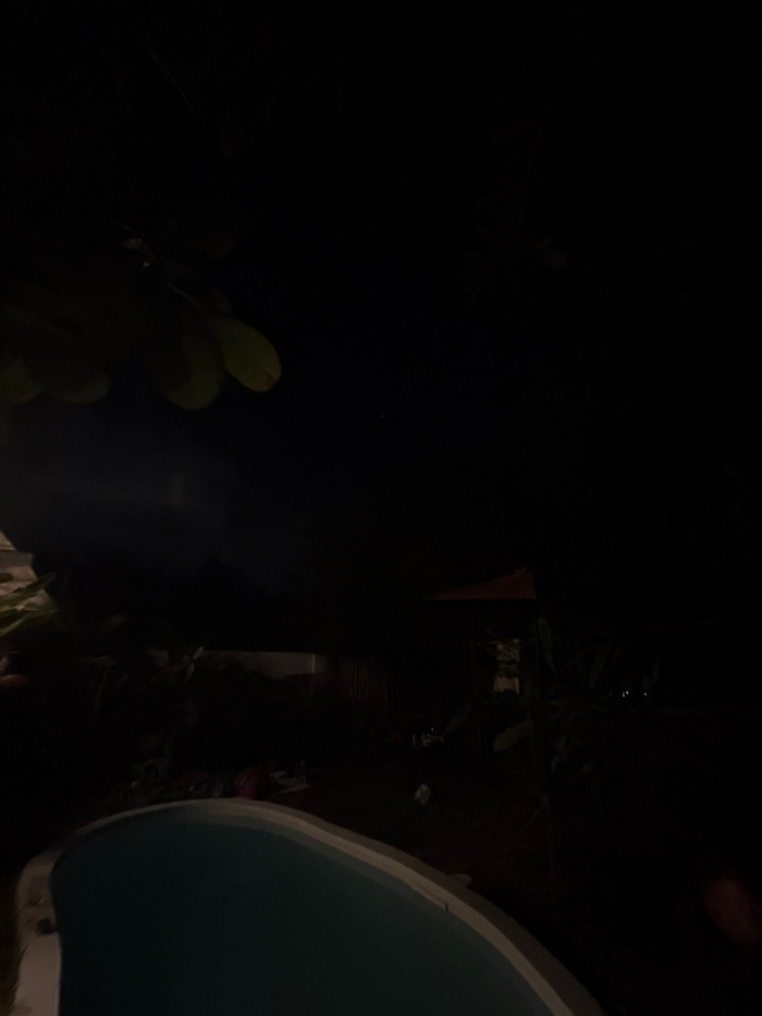 The scene depicts an outdoor residential or resort area in Moo 4, Thailand, at night, under very low ambient light conditions. The foreground features the curved edge of a light blue-green swimming po…read more