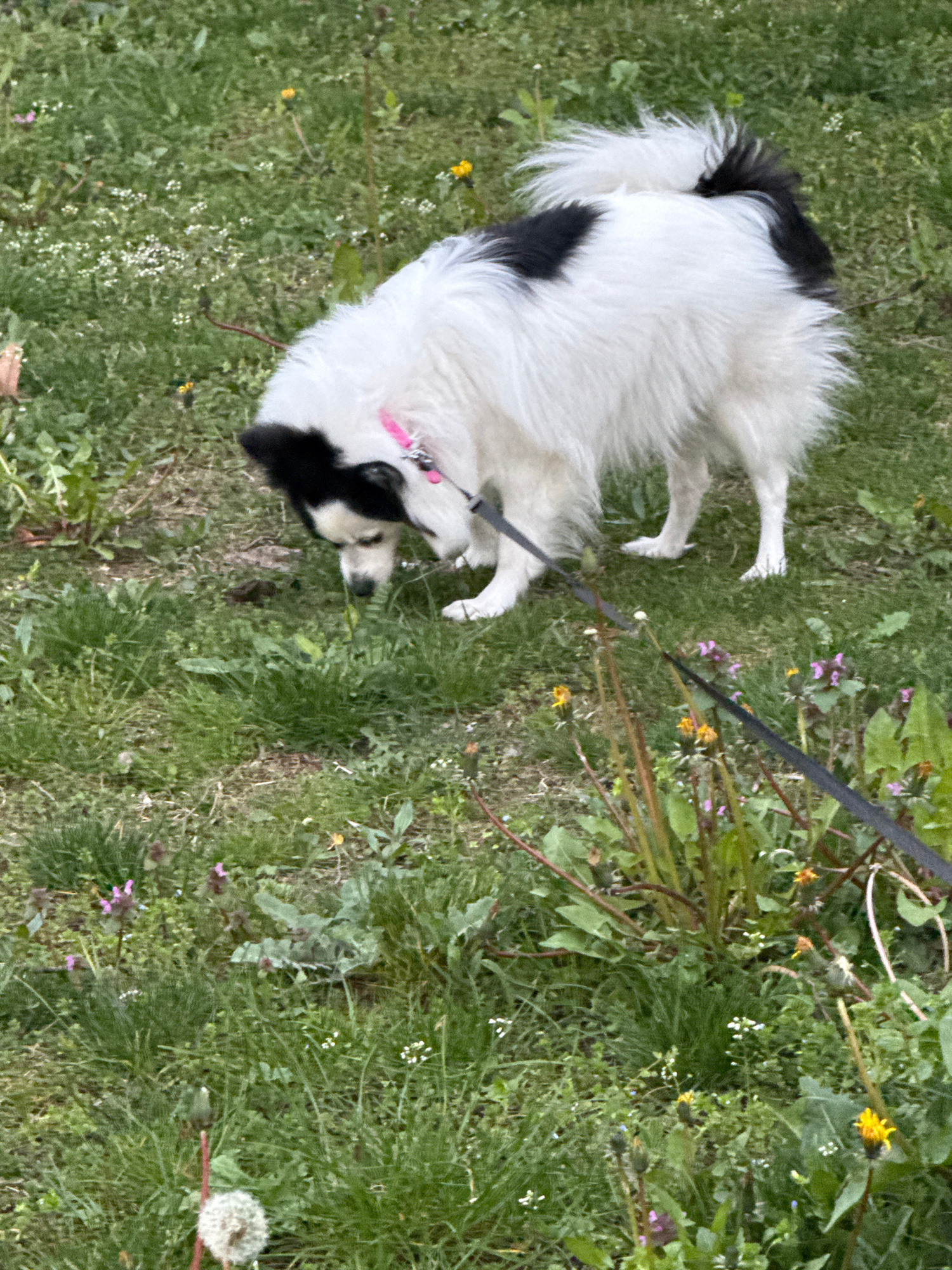 A medium shot depicts a black and white dog in a grassy area in Stara Zagora, Bulgaria. The dog is on a leash and near a small patch of foliage including dandelions. The dog appears to be sniffing the…read more