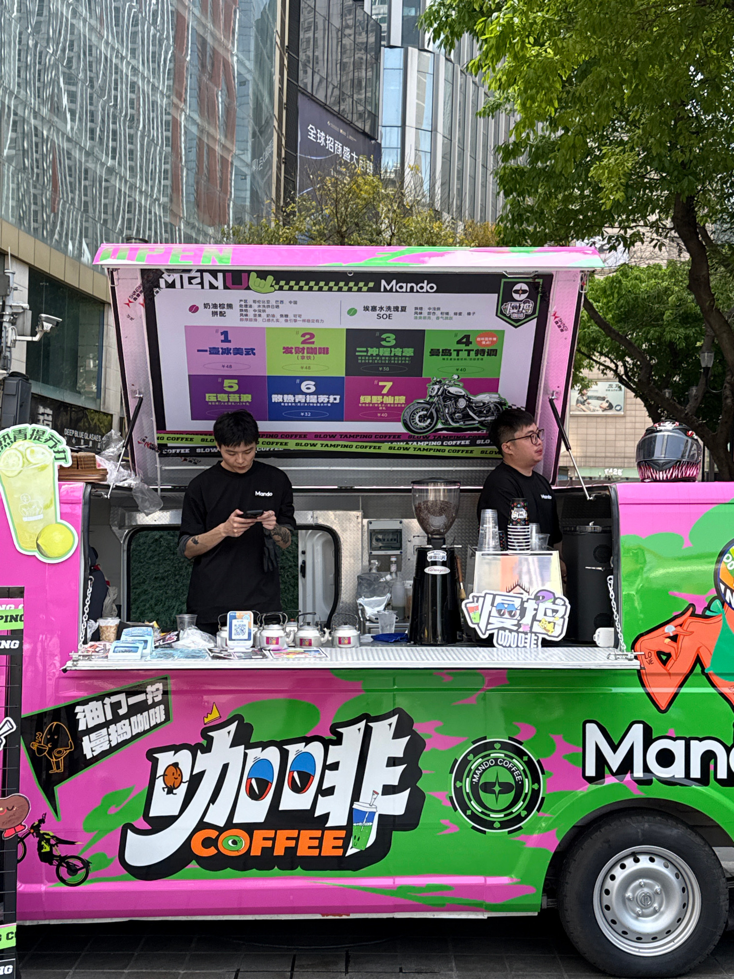 A vibrant pink and green "Mando Coffee" food truck operates outdoors in an urban setting, likely in Yuzhong District, China, given the visible Chinese text and location context. The scene is set durin…read more
