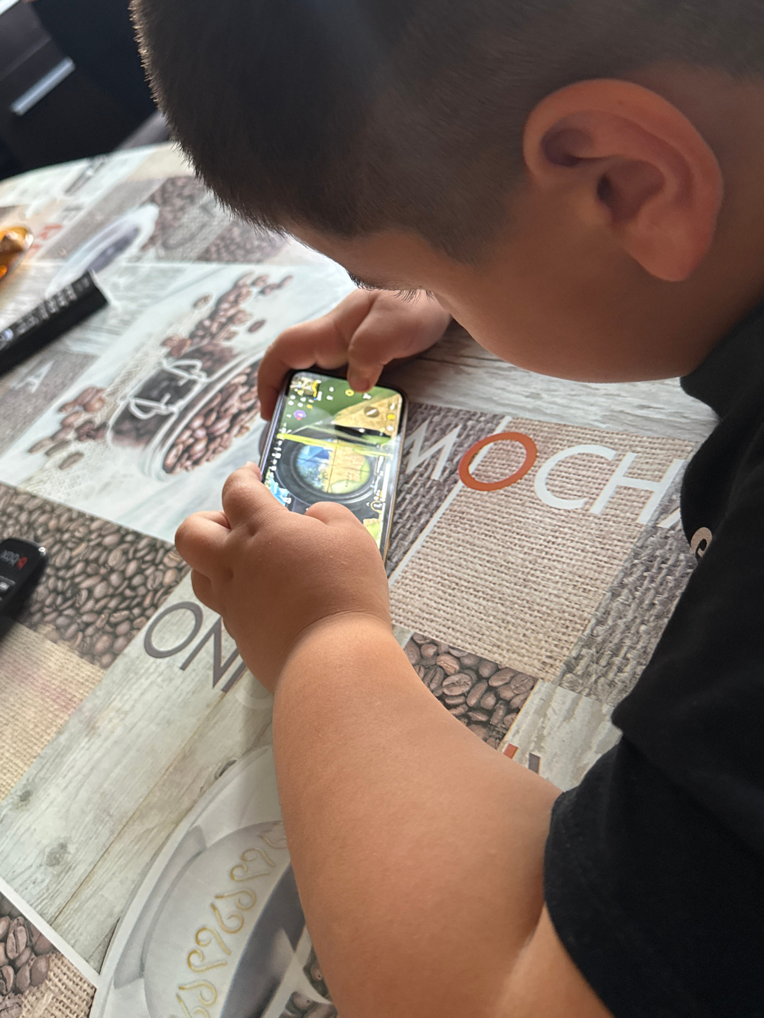 A young child is intently focused on a smartphone held in their hands. The phone's screen displays a complex, possibly gaming interface with maps and targeting reticles. The child is seated at a table…read more