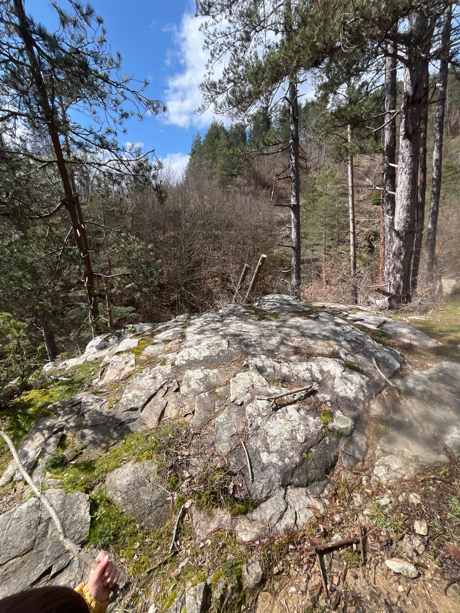 The image depicts a scene in a natural environment. A large rock formation dominates the foreground, covered with patches of moss and small vegetation. A hand, possibly holding a stick, is visible inβ¦read more