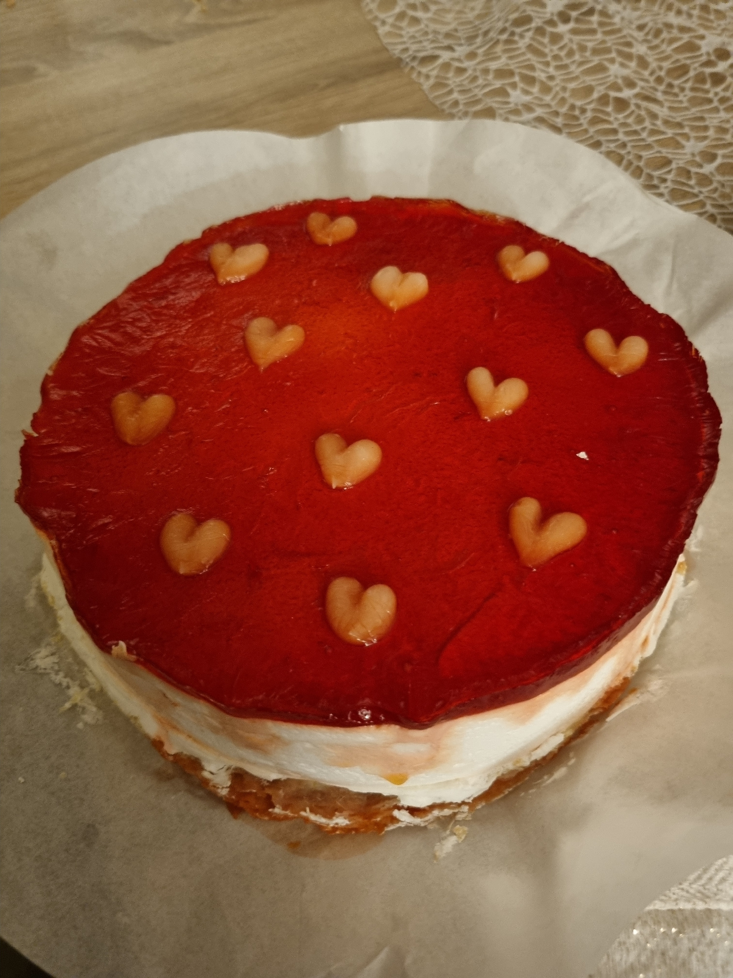 A top-down shot shows a cake with a bright red jelly topping, decorated with small, pale hearts arranged somewhat randomly. The cake is round and appears to have a layer of white frosting around the s…read more