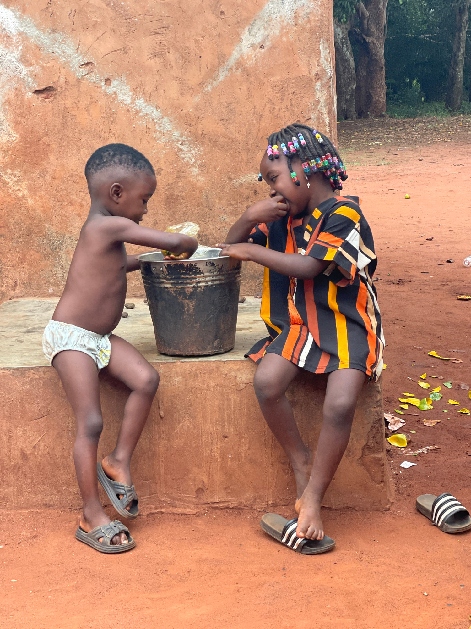 The image depicts two children outdoors in Ogbe, Nigeria, in what appears to be a courtyard or yard with reddish-brown soil. An older girl with braided hair adorned with colorful beads, and wearing a striped dress, is seated on a raised cement structure. A younger boy, wearing only a diaper and sandals, is lying on the ground holding a metal bucket. The girl appears to be looking at and perhaps interacting with the boy. A pair of sandals is visible on the ground near the girl. Background vegetation, including trees, is visible behind the children. | Open Wire