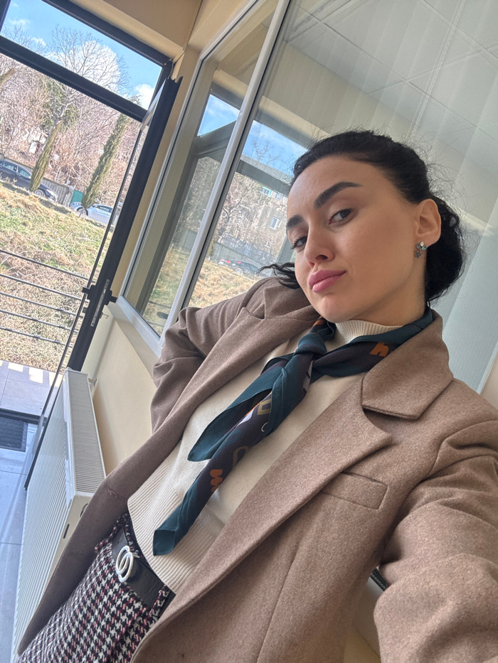 A female individual is photographed in a selfie-style image indoors, positioned in front of a large window or glass enclosure. She has dark hair pulled back, prominent eyebrows, and wears pink lipstic…read more