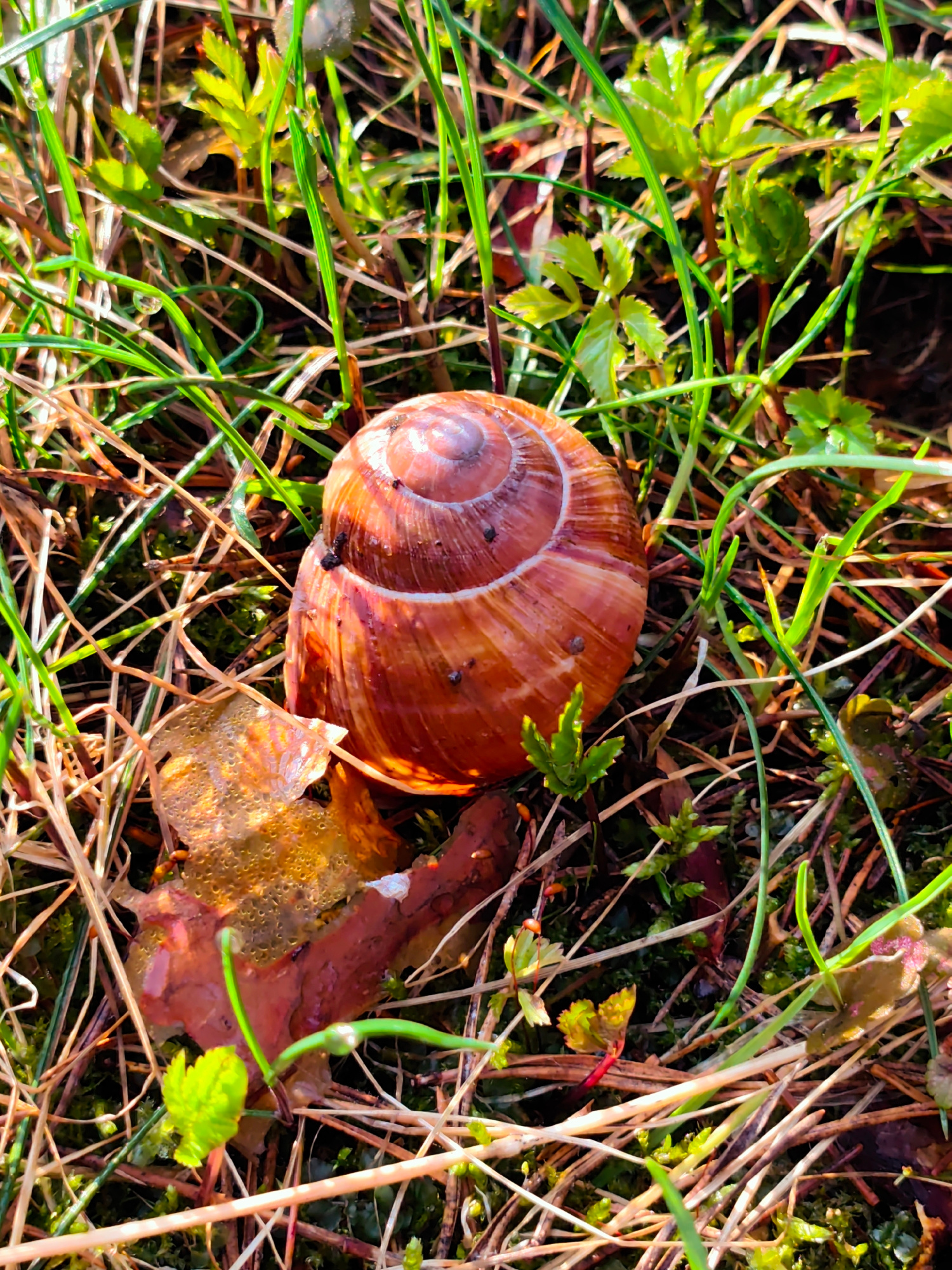 A close-up, high-angle shot captures a reddish-brown snail shell nestled amidst lush green grass, dry straw, and small leafy plants on what appears to be a forest or garden floor in Kratovo, Russia. T…read more