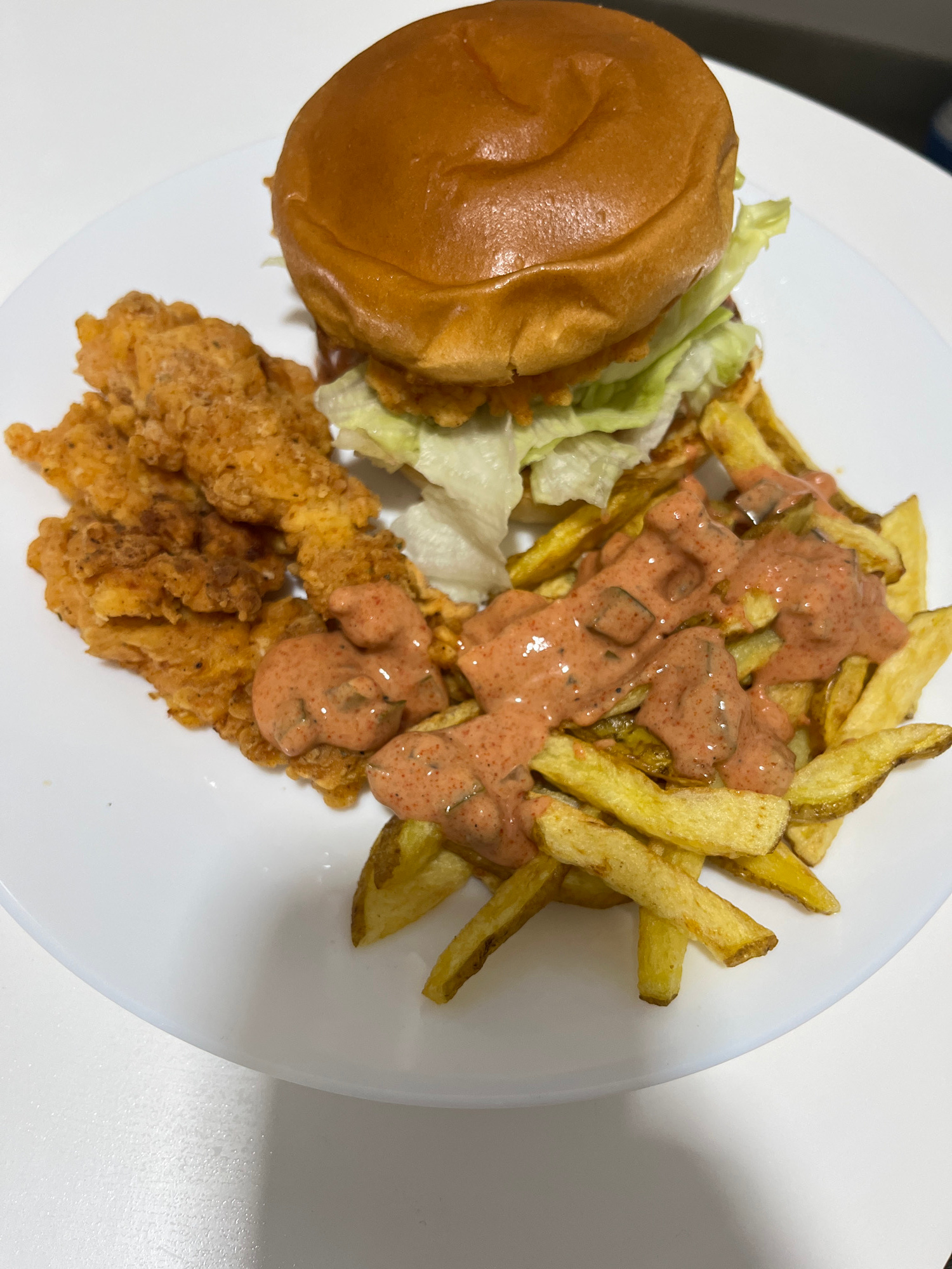 On a white plate sits a meal consisting of a burger with lettuce, french fries, and two pieces of fried chicken. A pink sauce is drizzled over the fries and chicken. The location is unknown.