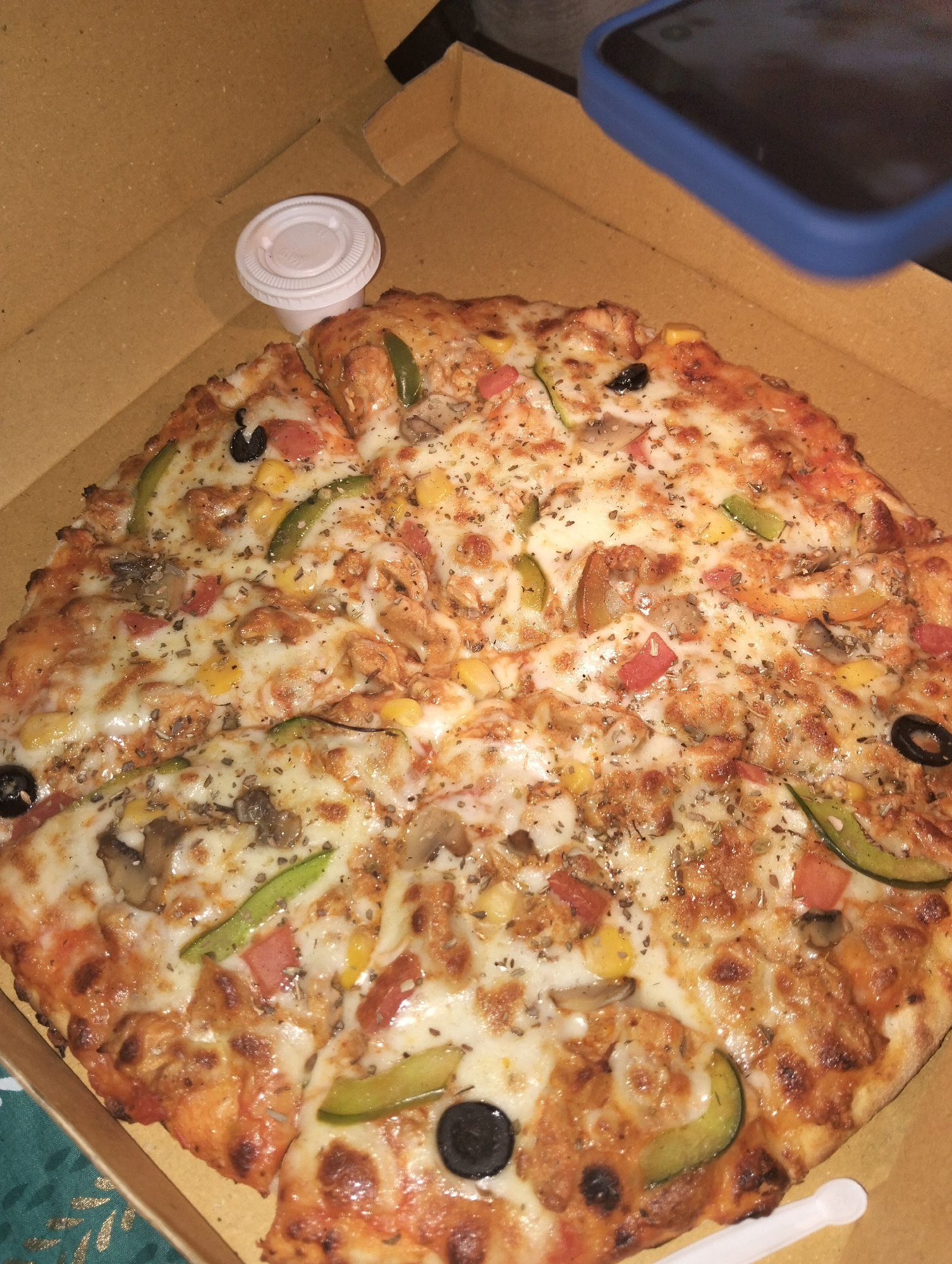 A top-down shot shows a pizza in a cardboard box, presumably for delivery or takeout. The pizza is round, cut into slices, and topped with melted cheese, what appear to be mushrooms, bell peppers, tom…read more