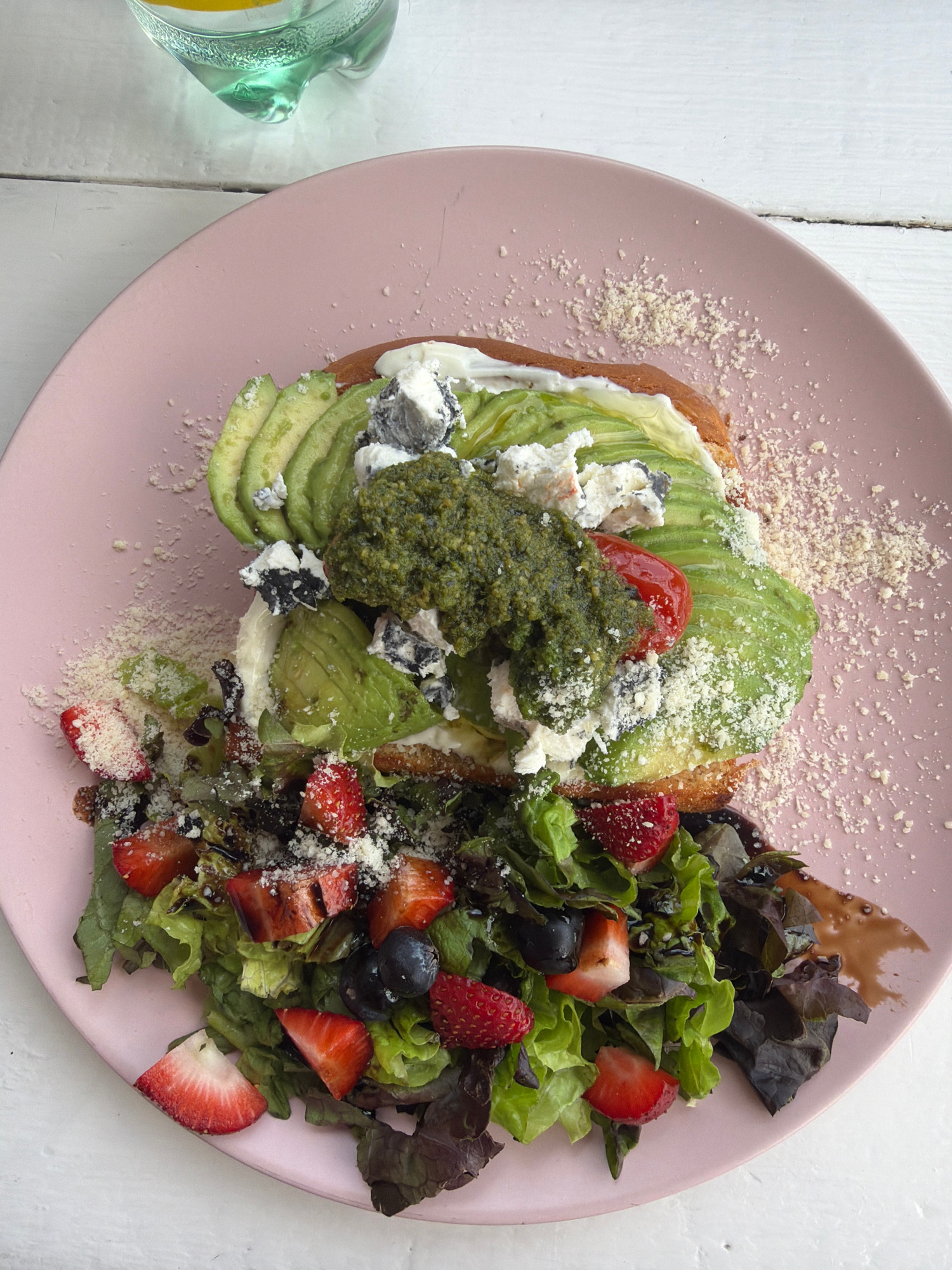 A top-down shot shows a pink plate featuring avocado toast and a side salad. The toast is topped with avocado slices, pesto, white cheese, and what appears to be parmesan cheese. The salad consists of…read more