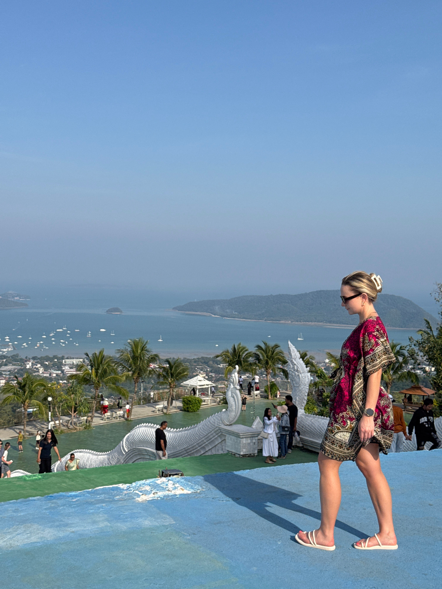 The image shows a view from a high point in Karon, Thailand, likely overlooking the coastline. A woman in a patterned dress and sandals stands on a blue surface, looking towards the view. In the backg…read more