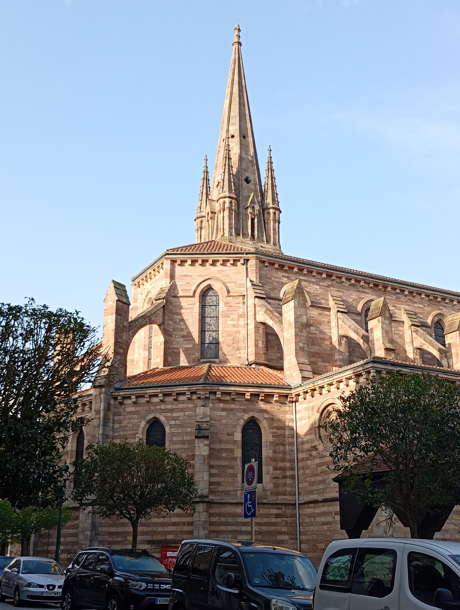 The image shows the exterior of the Iglesia de la Asunción in Torrelavega, Spain, viewed from street level. The church is constructed of reddish-brown stone, featuring a tall central spire and smaller…read more
