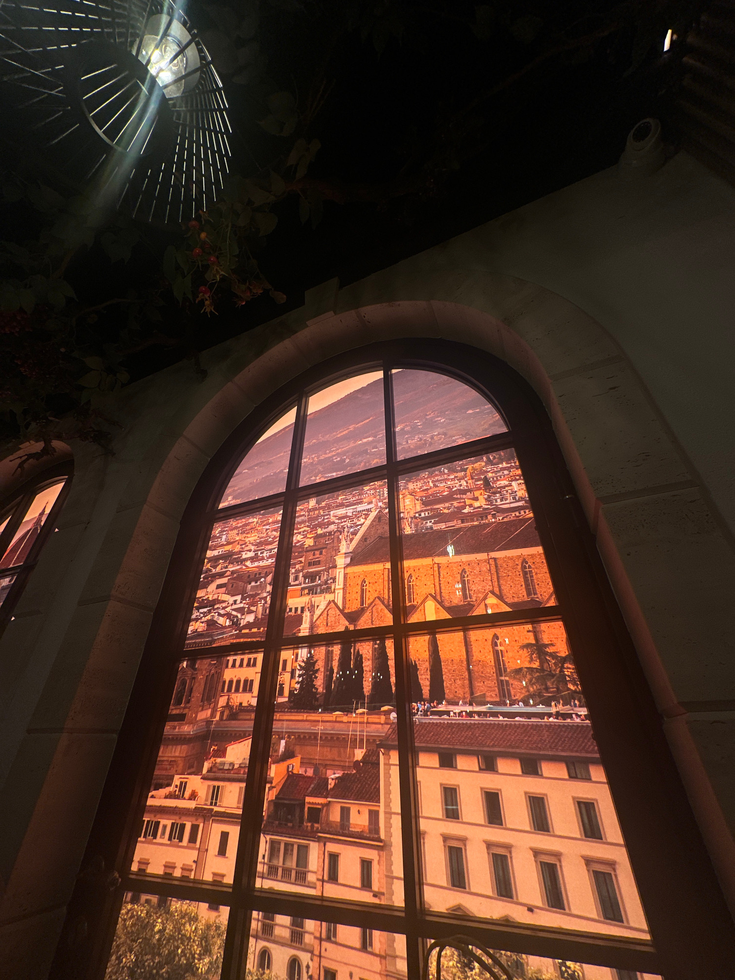 A low-angle shot of an arched window offering a vivid view of Florence, Italy. The architecture through the window is in warm tones, suggesting a sunrise or sunset. Outside the window, to the left, is…read more