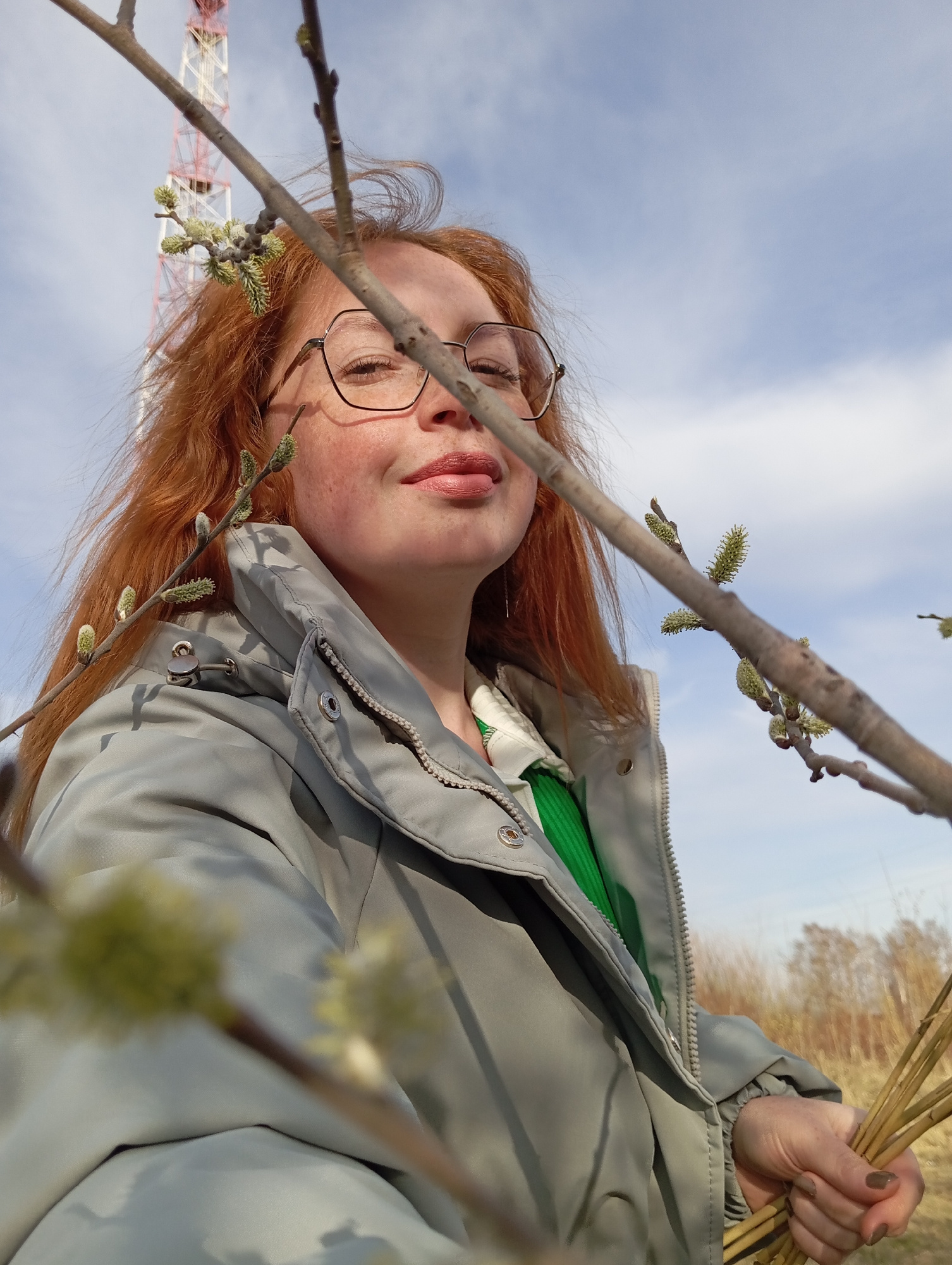 A low-angle outdoor shot shows a red-haired woman wearing glasses and a light gray jacket in Yurgamysh, Russia. In her hand, she holds thin, dry stalks. Emerging branches with budding catkins frame he…read more