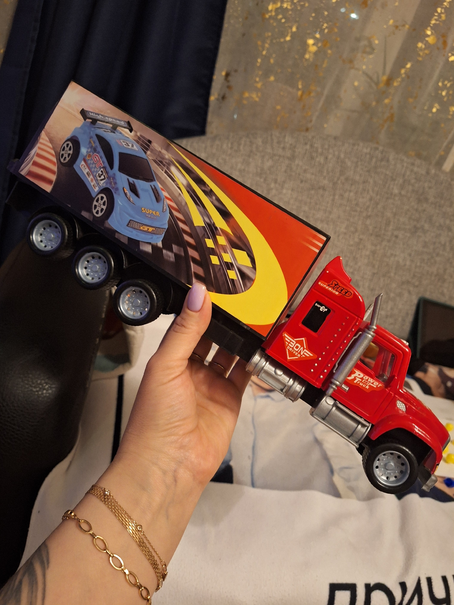 An indoor, close-up shot features a person's right hand holding a red toy semi-trailer truck. The toy is angled upwards, with the truck's cab to the right and a section of its trailer to the left. Th…read more