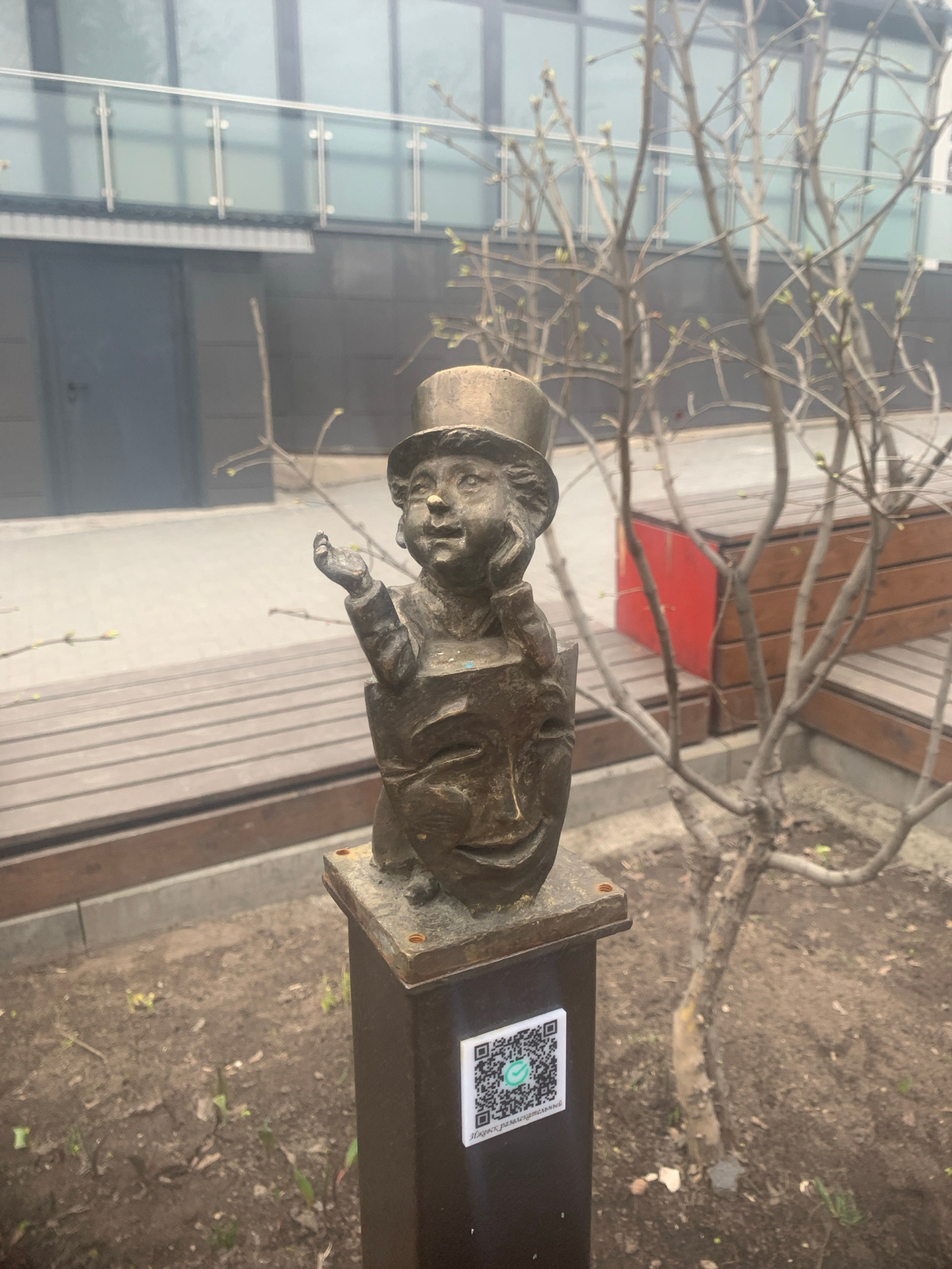 A bronze statue of a small, uniformed person with a hat and outstretched hand stands on a dark metal post in Izhevsk, Russia. A QR code sticker is adhered to the side of the post. Behind the statue is…read more