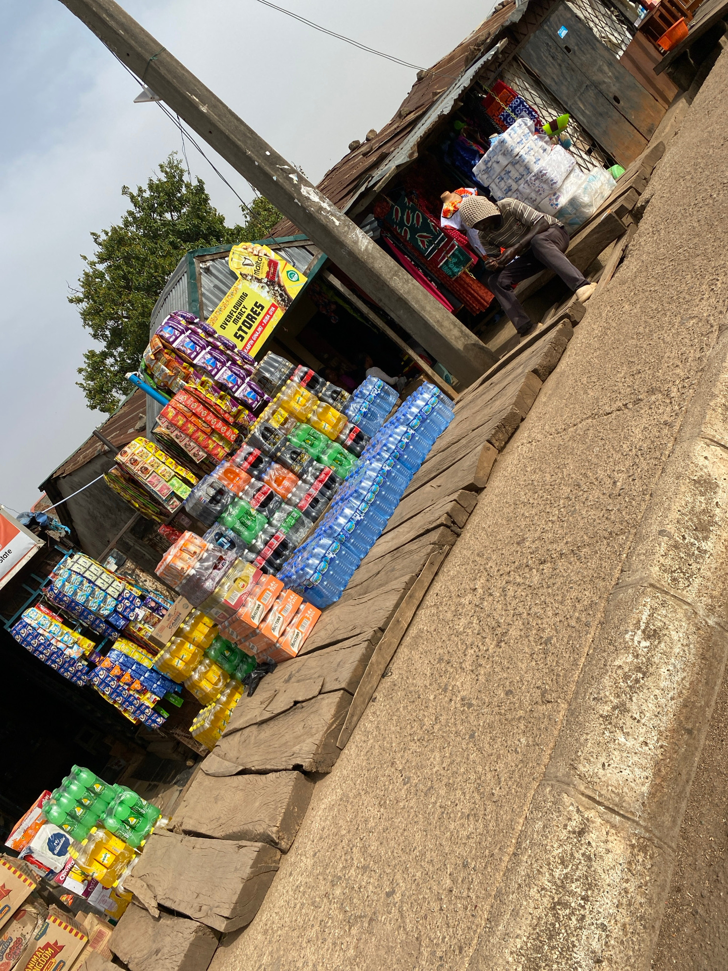 This image depicts a bustling open-air vendor stall or small shop in Bukuru, Nigeria, captured during daytime under a bright sky. The scene is dominated by an extensive display of goods, primarily bev…read more