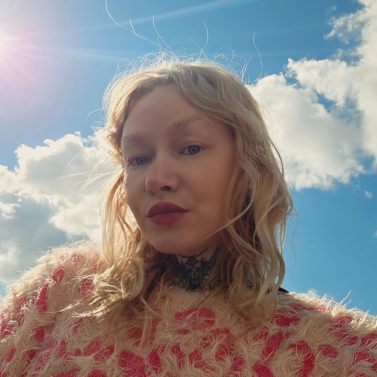 A low-angle portrait of a blonde woman with blue eyes and dark lipstick, taken outdoors. She is wearing a textured pink and white garment, possibly a sweater or jacket. Behind her is a bright blue sky…read more