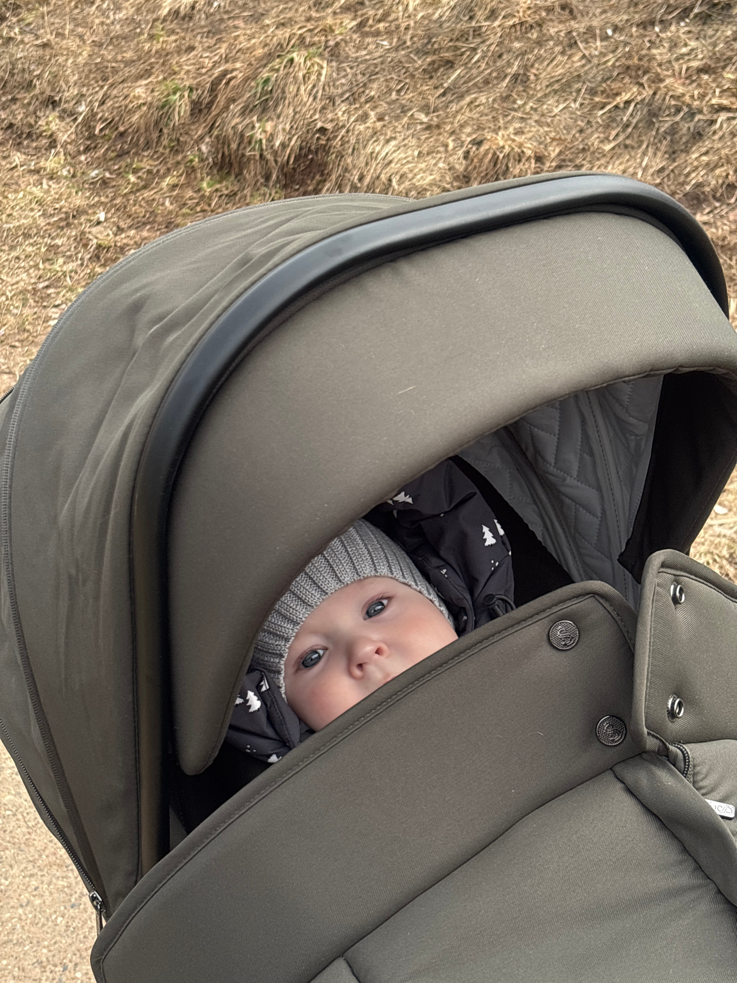 A baby is nestled in a stroller. The baby is wearing a gray knit hat and a black jacket with white tree designs. The stroller is olive green. Dry grass is visible near the stroller's edge. The locatio…read more