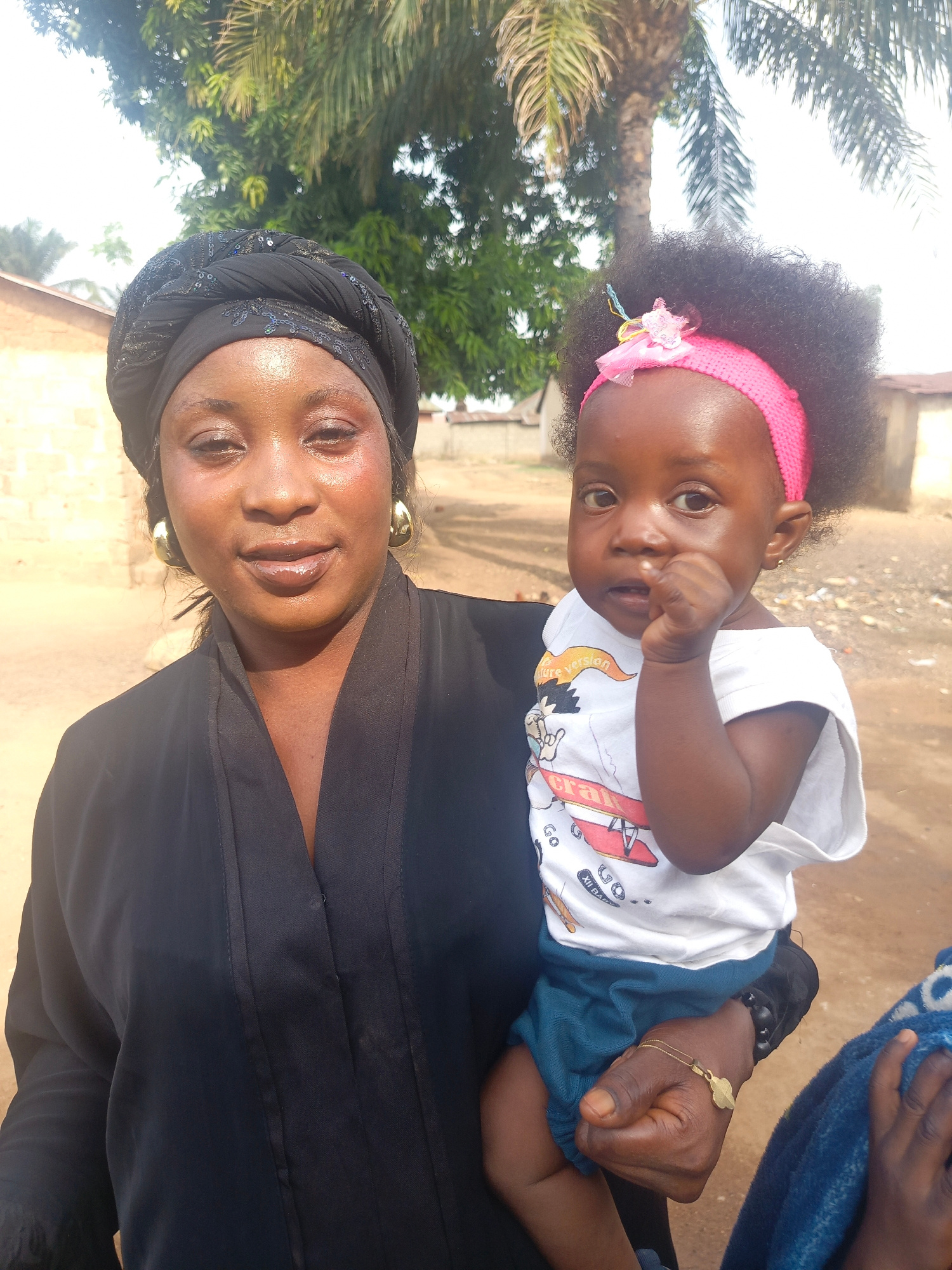 A woman is holding a baby in an outdoor setting in Akwanga, Nigeria. The woman is wearing a black head covering, black clothing, and gold hoop earrings. The baby has a pink headband with a flower and…read more
