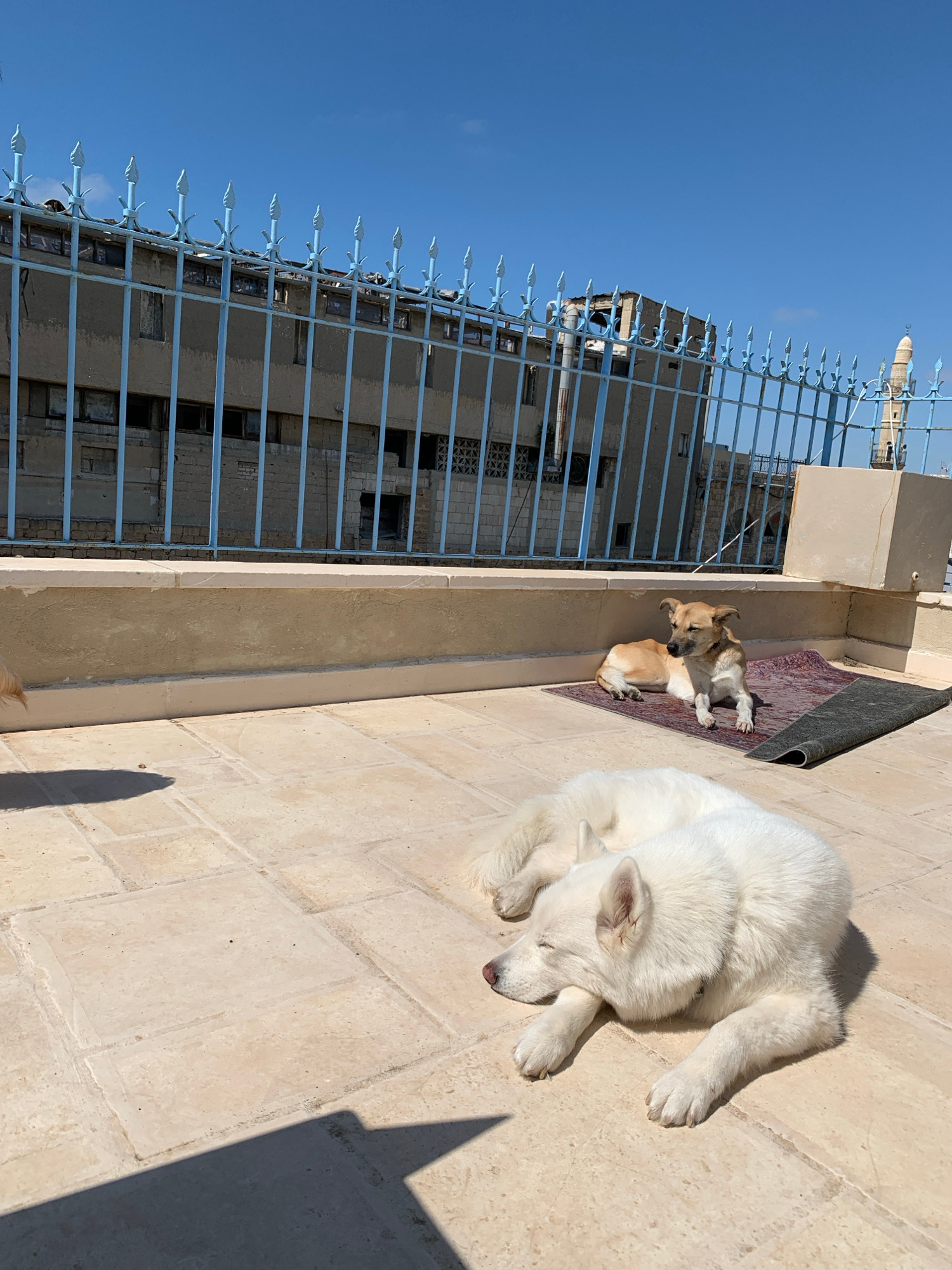 The scene captures an outdoor setting, possibly a balcony or rooftop in Tel Aviv, Israel, based on the presence of a building with distinctive architecture. The primary subjects are two dogs. One is a large, white, long-haired dog, curled up and seemingly asleep on light-colored stone tiles. Next to it, a smaller, light-brown dog is resting on a small, maroon-colored rug. A blue metal fence with spear-shaped tips lines the edge of the structure, offering a partial view of the urban landscape beyond, including residential buildings under a clear blue sky. The scene appears to be sunlit. | Open Wire