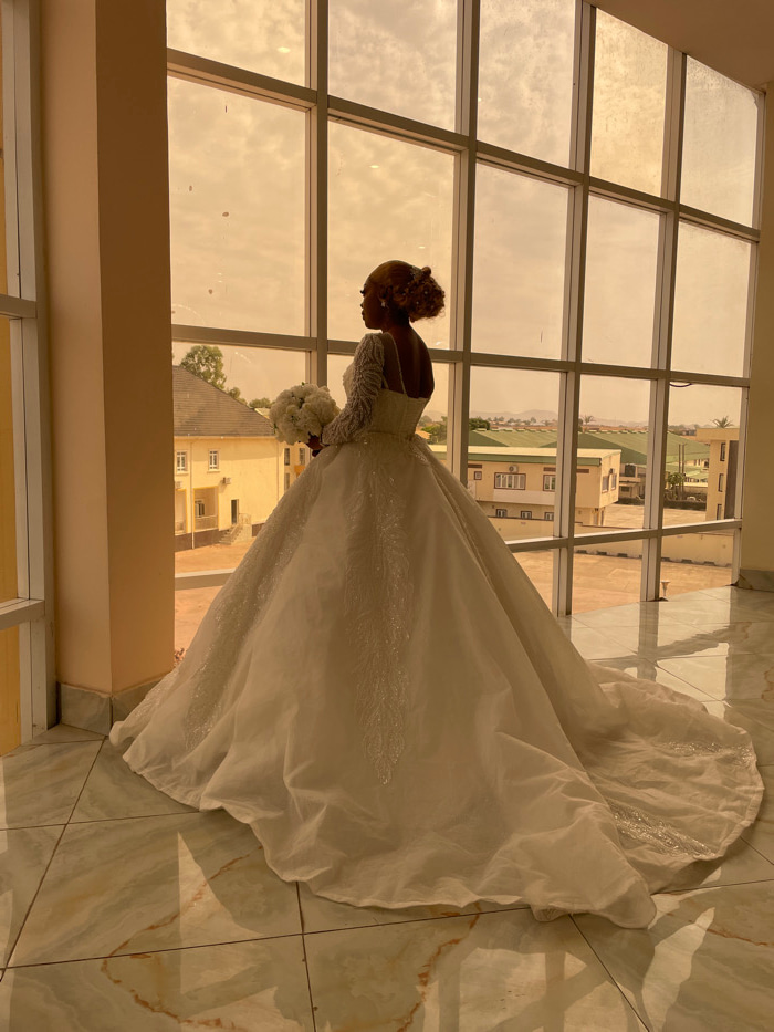 An adult individual with dark skin and a light-colored, elaborate updo hairstyle stands indoors, viewed from the rear left side. The person is wearing a voluminous white wedding gown with long, embell…read more