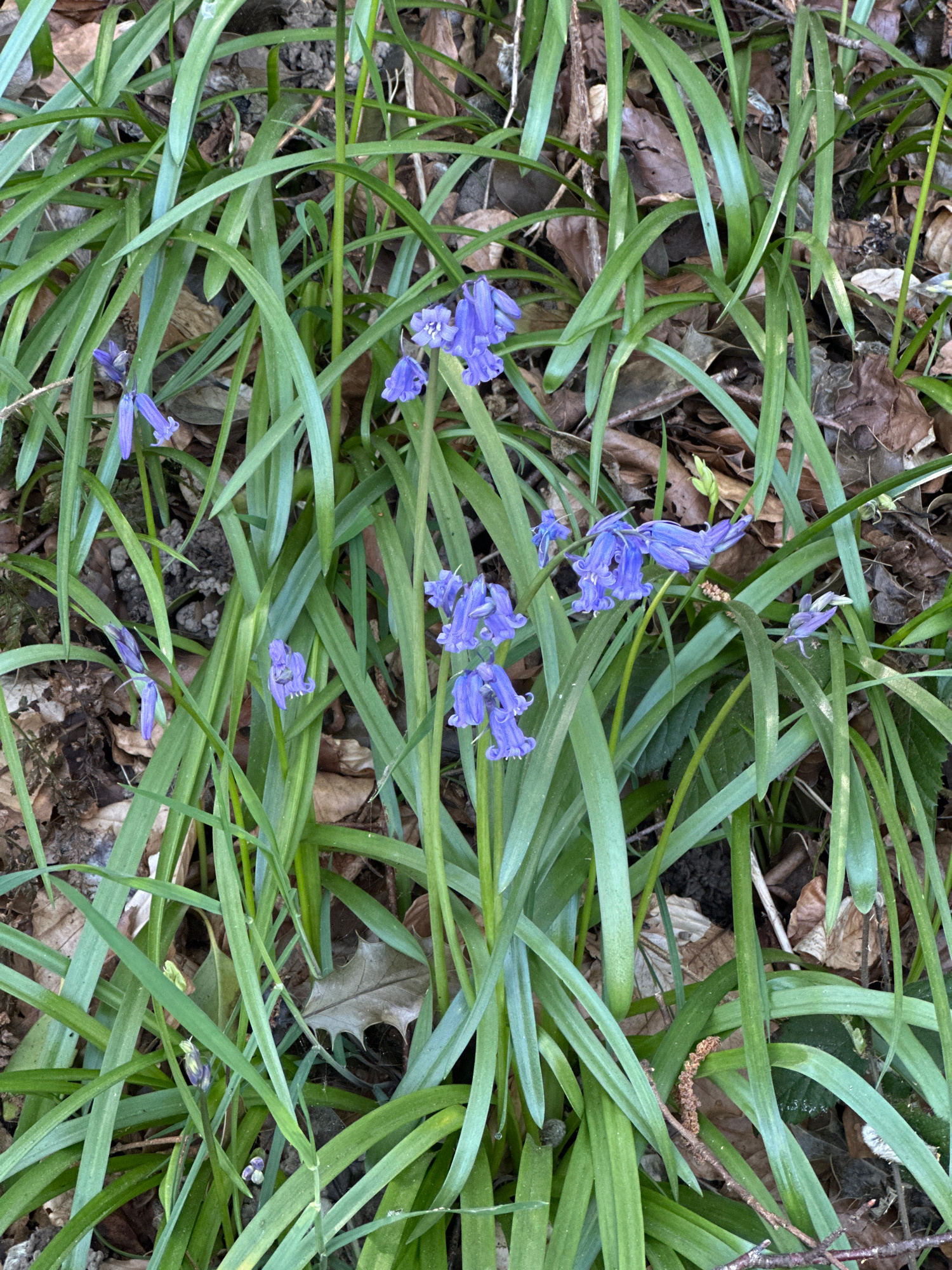 A close-up, ground-level shot depicts a cluster of bluebell flowers amidst long, green blades of grass and scattered dead leaves. The flowers, with their characteristic bell-shaped blooms, are a vibra…read more