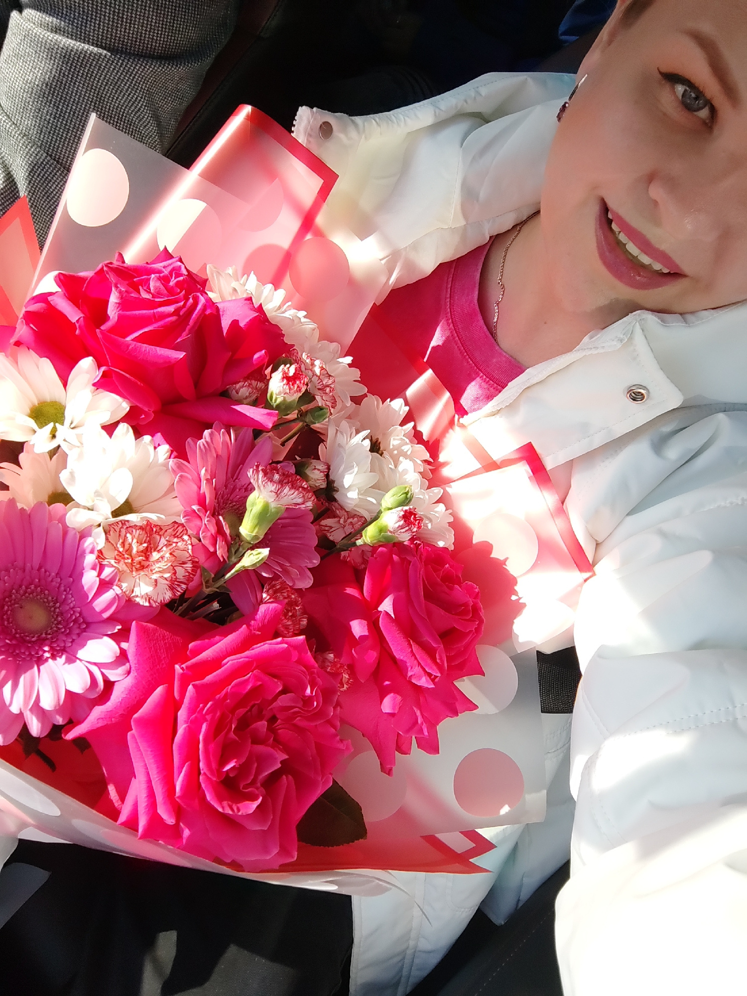A selfie of a woman smiling with a bouquet of pink and white flowers. The woman is wearing a pink t-shirt and a white jacket. The bouquet contains roses, gerberas, carnations, and daisies. The flowers…read more