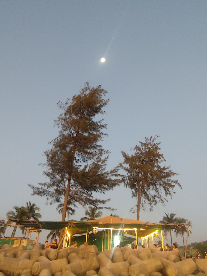 An evening scene is depicted at a coastal location in Querim, India. The pale blue-grey sky occupies the upper two-thirds of the frame, featuring a bright, near-full moon slightly above the center, wi…read more
