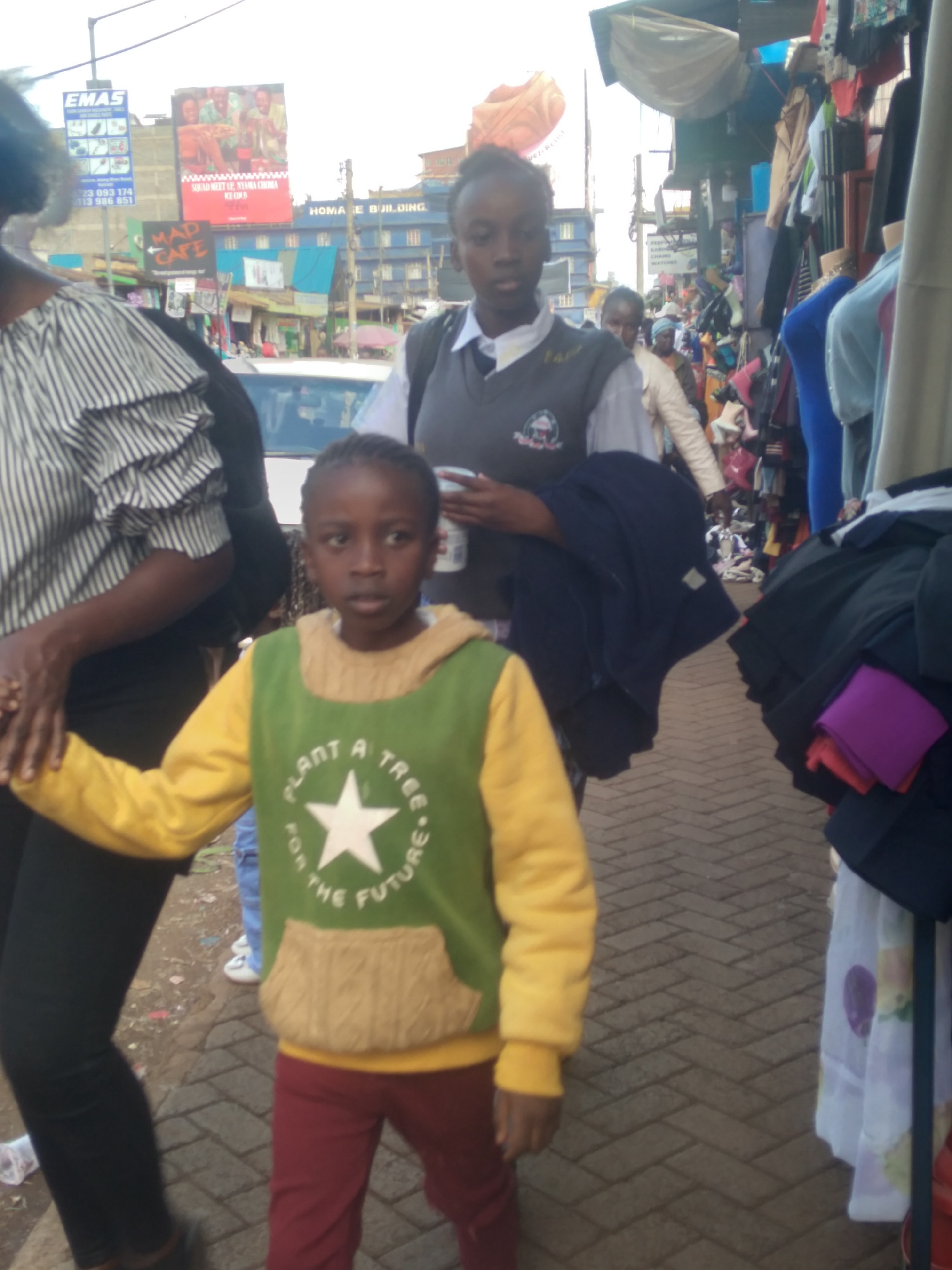 The image shows a street scene in Nyeri, Kenya. In the foreground, a young girl wearing a green and yellow sweater with the text "PLANT A TREE FOR THE FUTURE" and a star on the front is standing with…read more