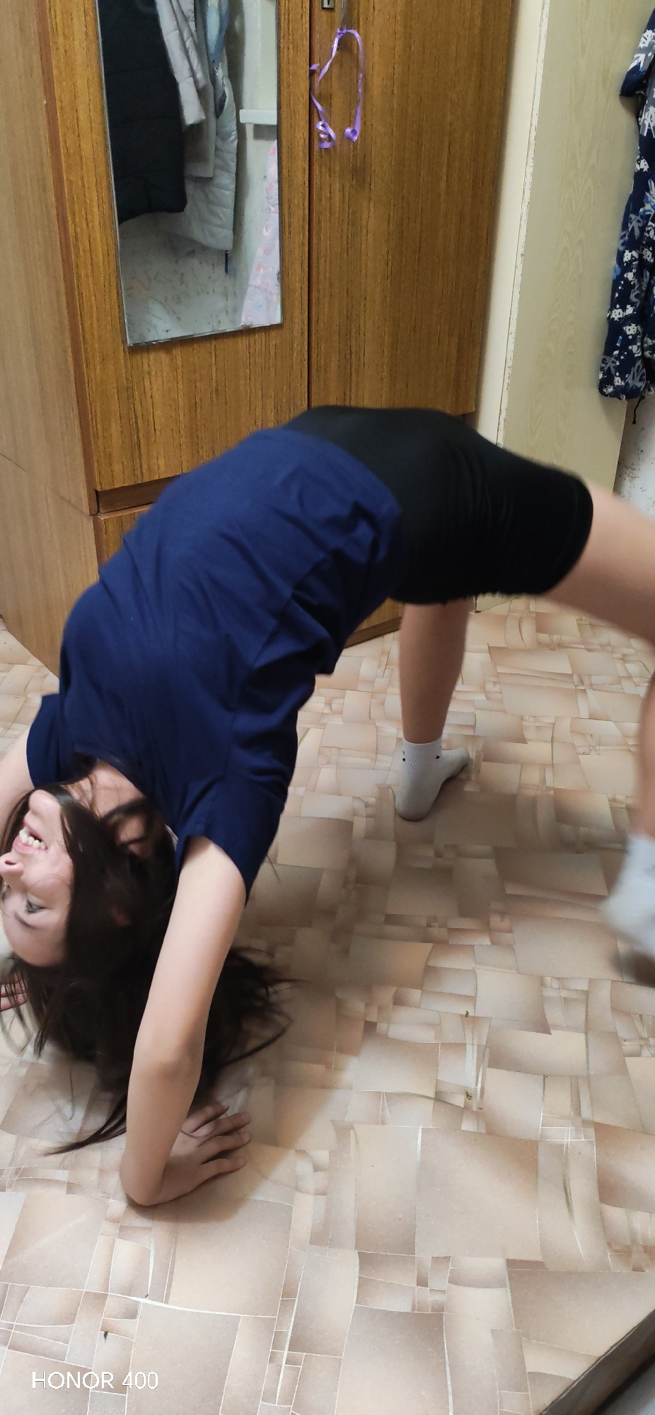 A woman performs a backbend on a tiled floor indoors. She wears a navy blue t-shirt and black shorts. Her dark hair hangs towards the floor. She is smiling. A wooden wardrobe stands in the background.…read more
