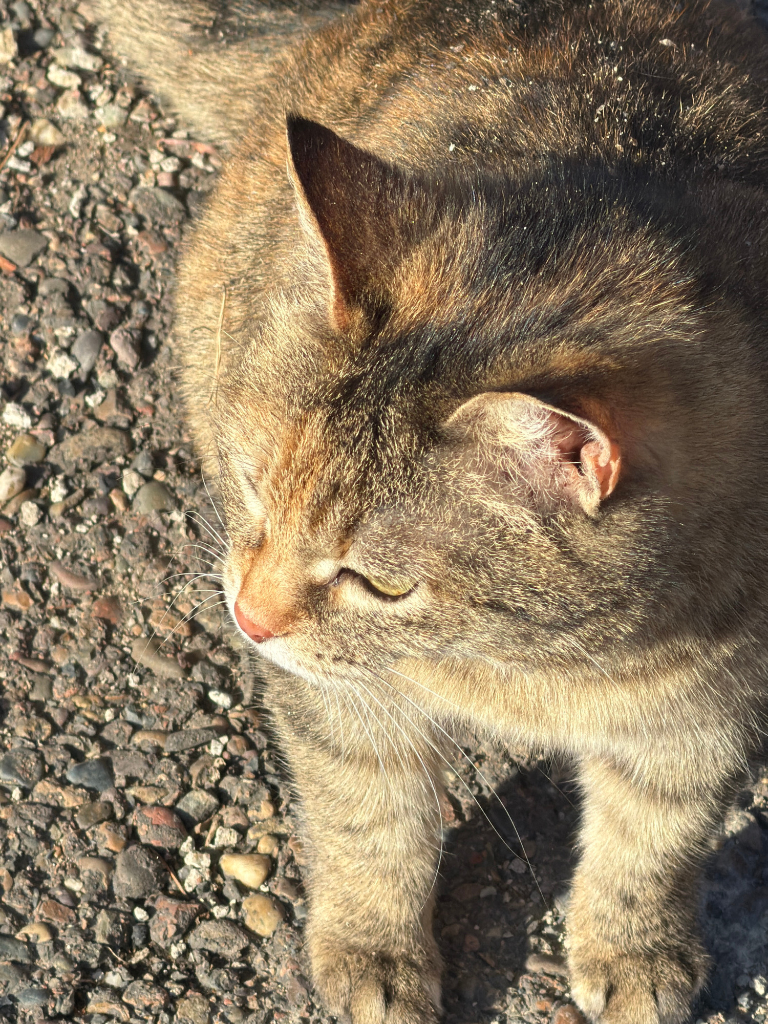 A tabby cat is lying on a surface of small, irregularly shaped rocks, likely a road or pathway. The cat's head is positioned in the upper portion of the image, facing toward the right. Its eyes are pa…read more