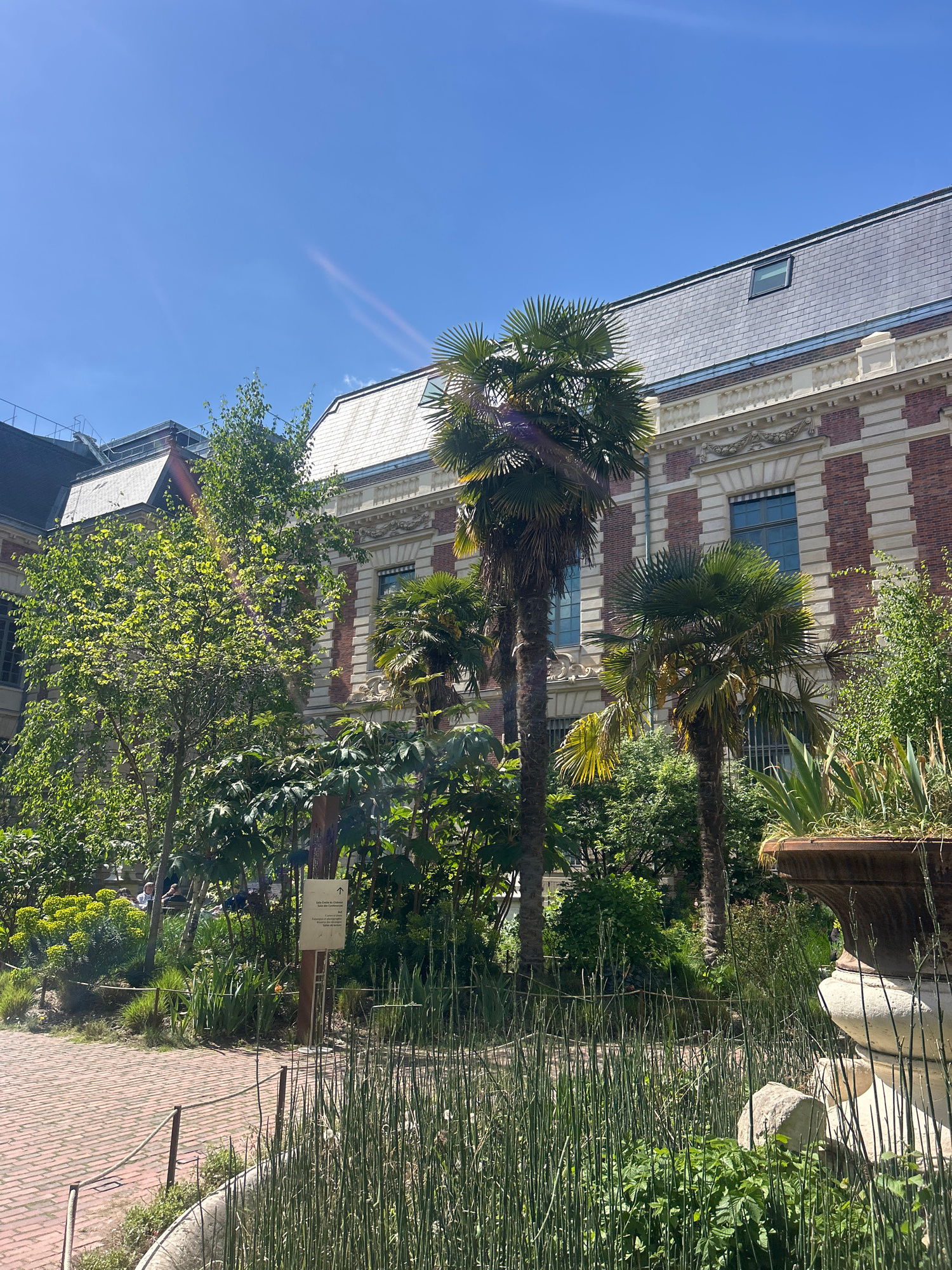 Here is a detailed description of the image: **Scene**: An outdoor scene with a brick pathway running through a garden setting, adjacent to a building with distinct architectural features. **Buildin…read more
